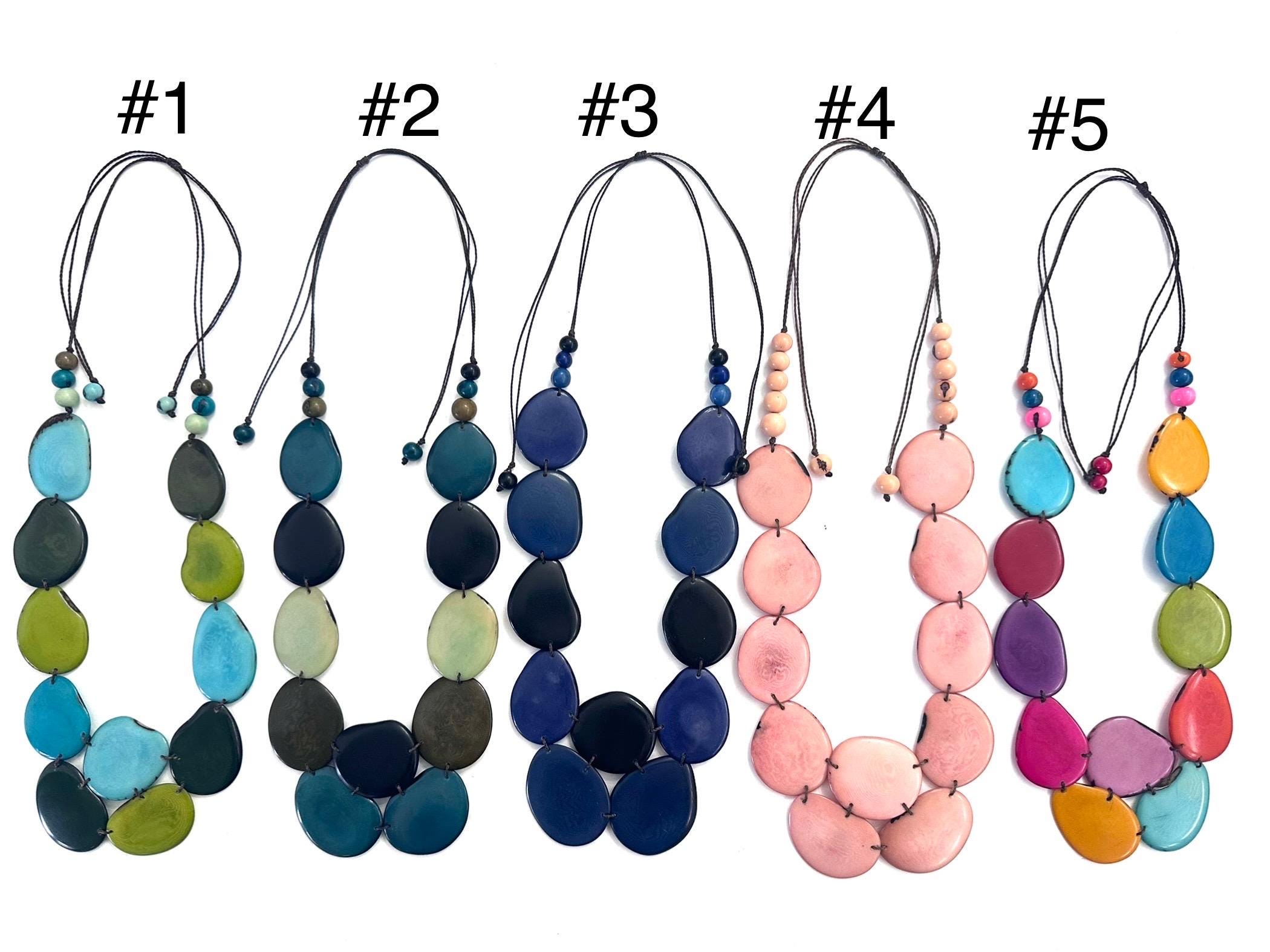 It is made with naturally dyed, hand-sliced tagua nut ivory beads.