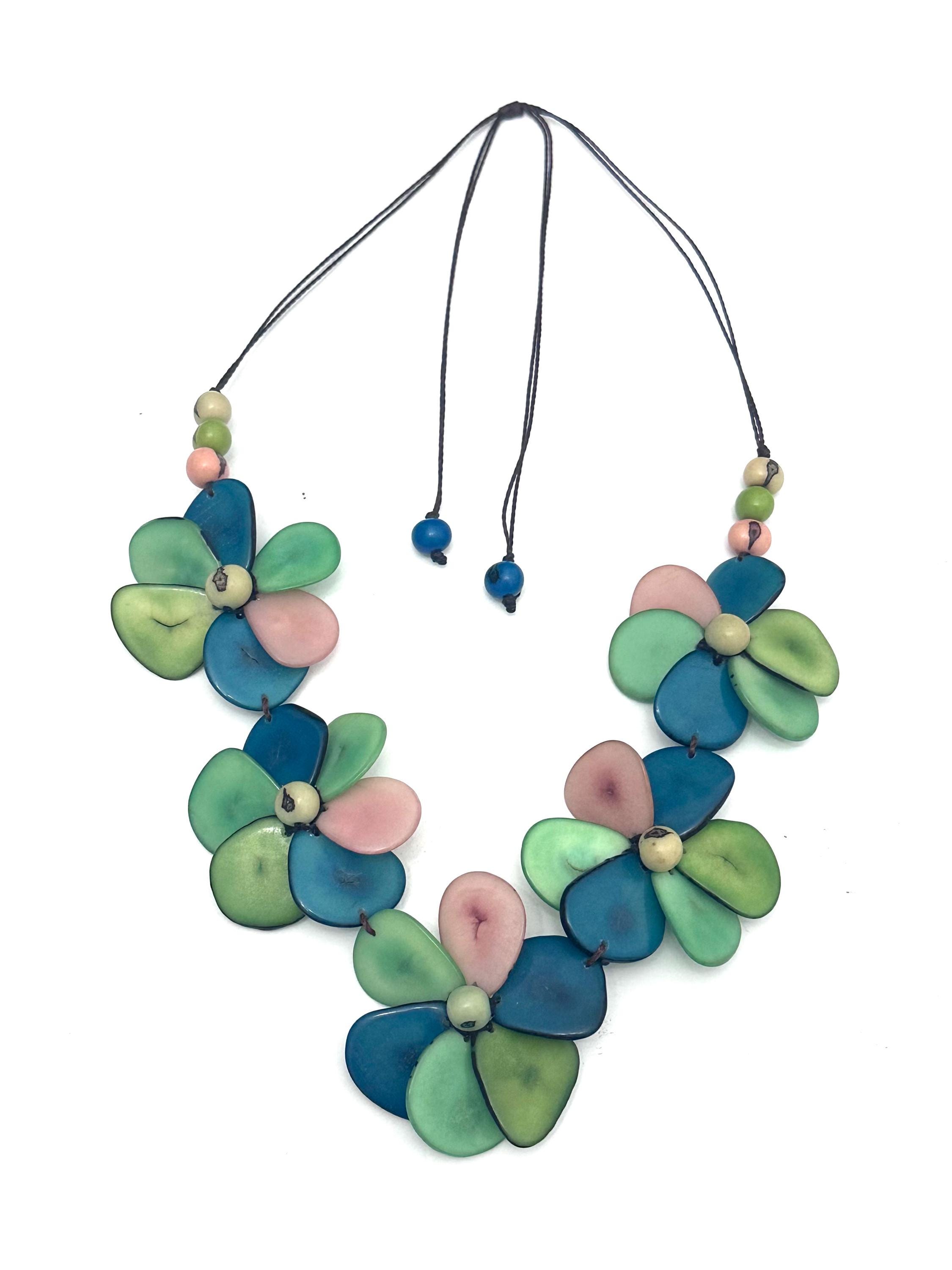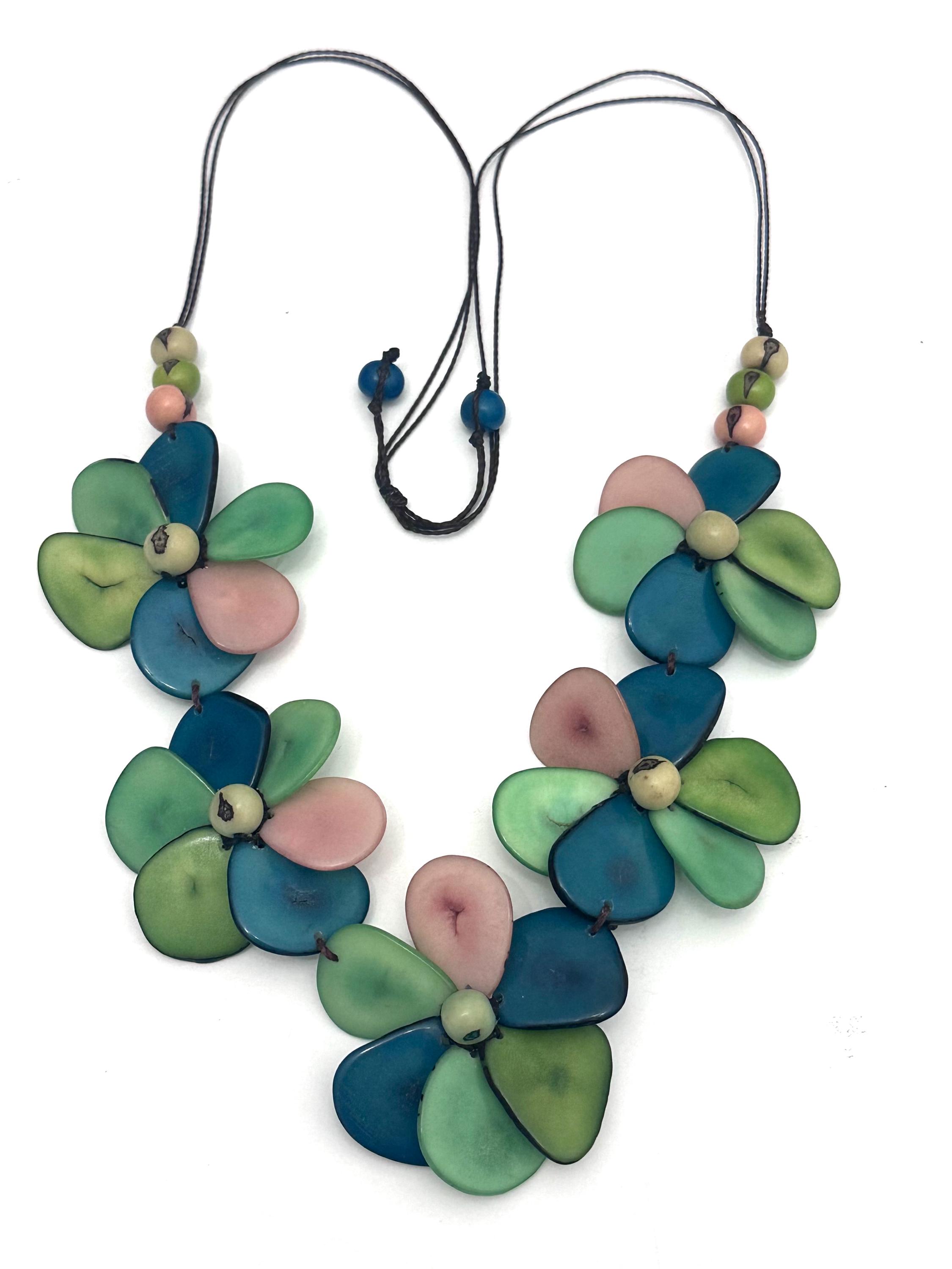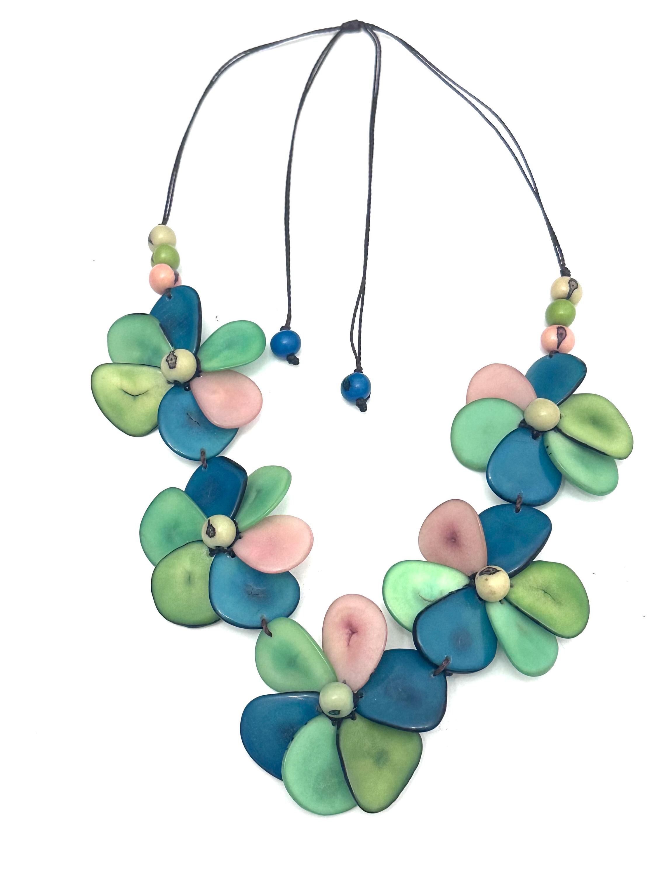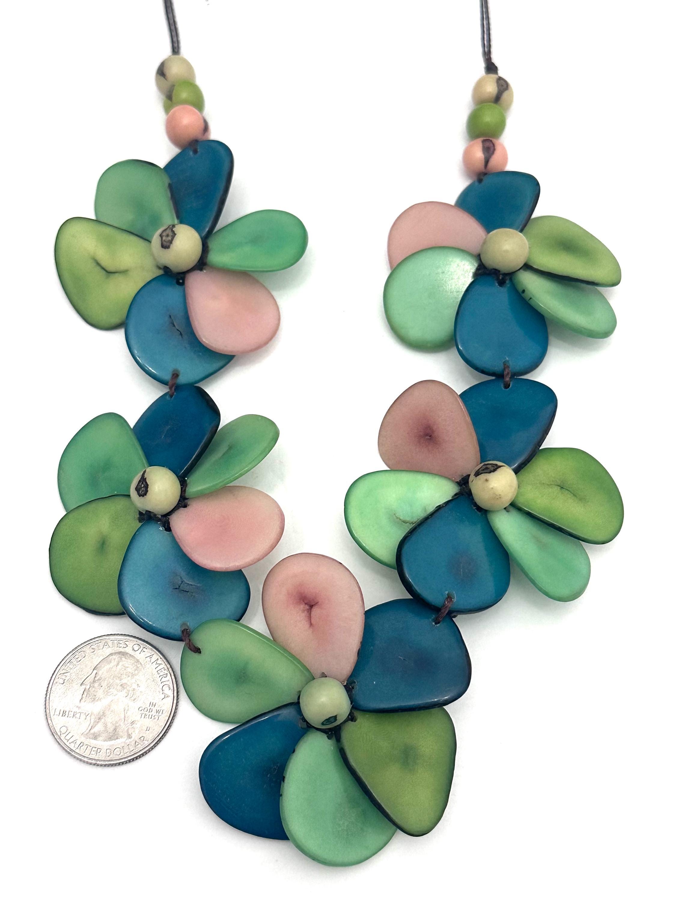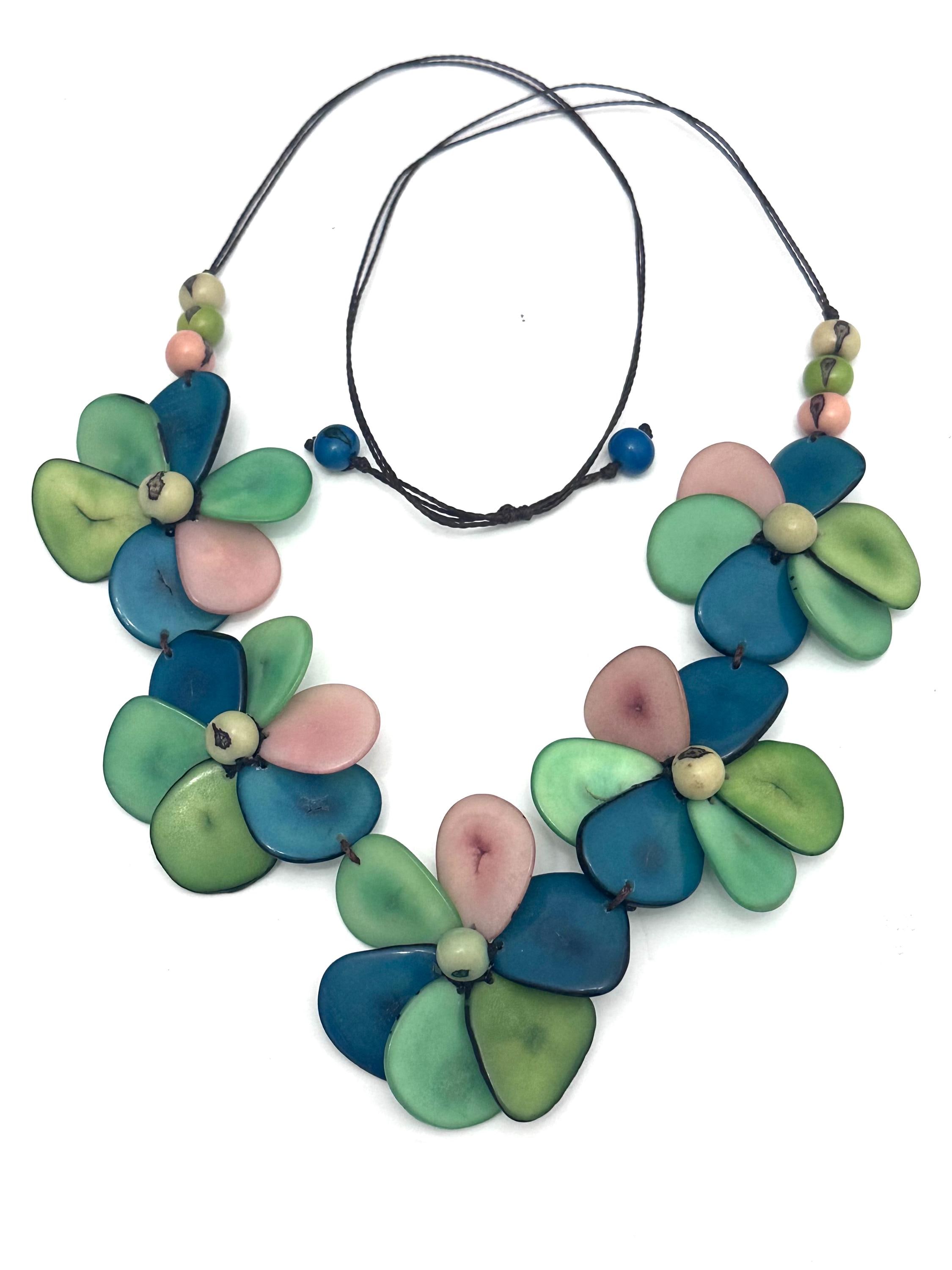 Statement Tagua Necklace, it features five beautiful flowers made with tagua slices petals on an adjustable string.