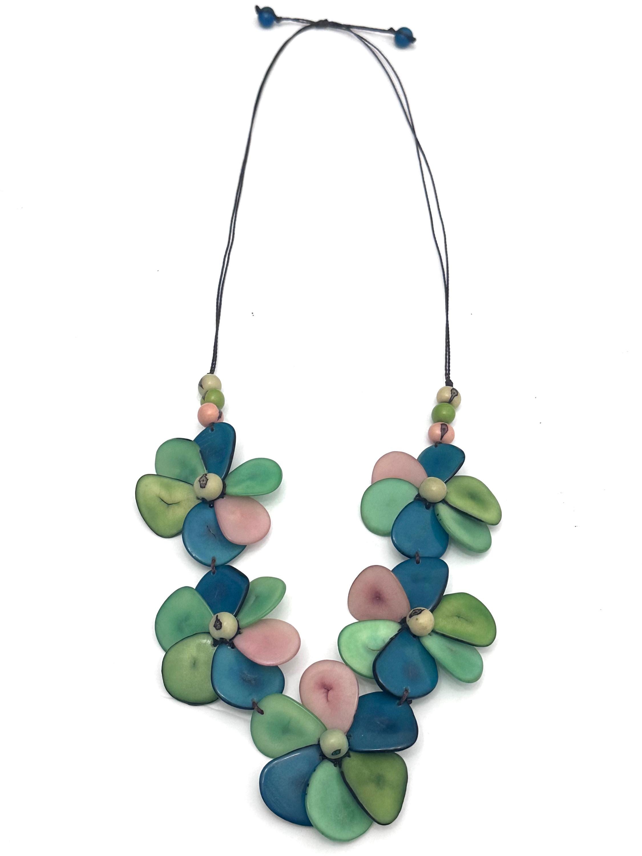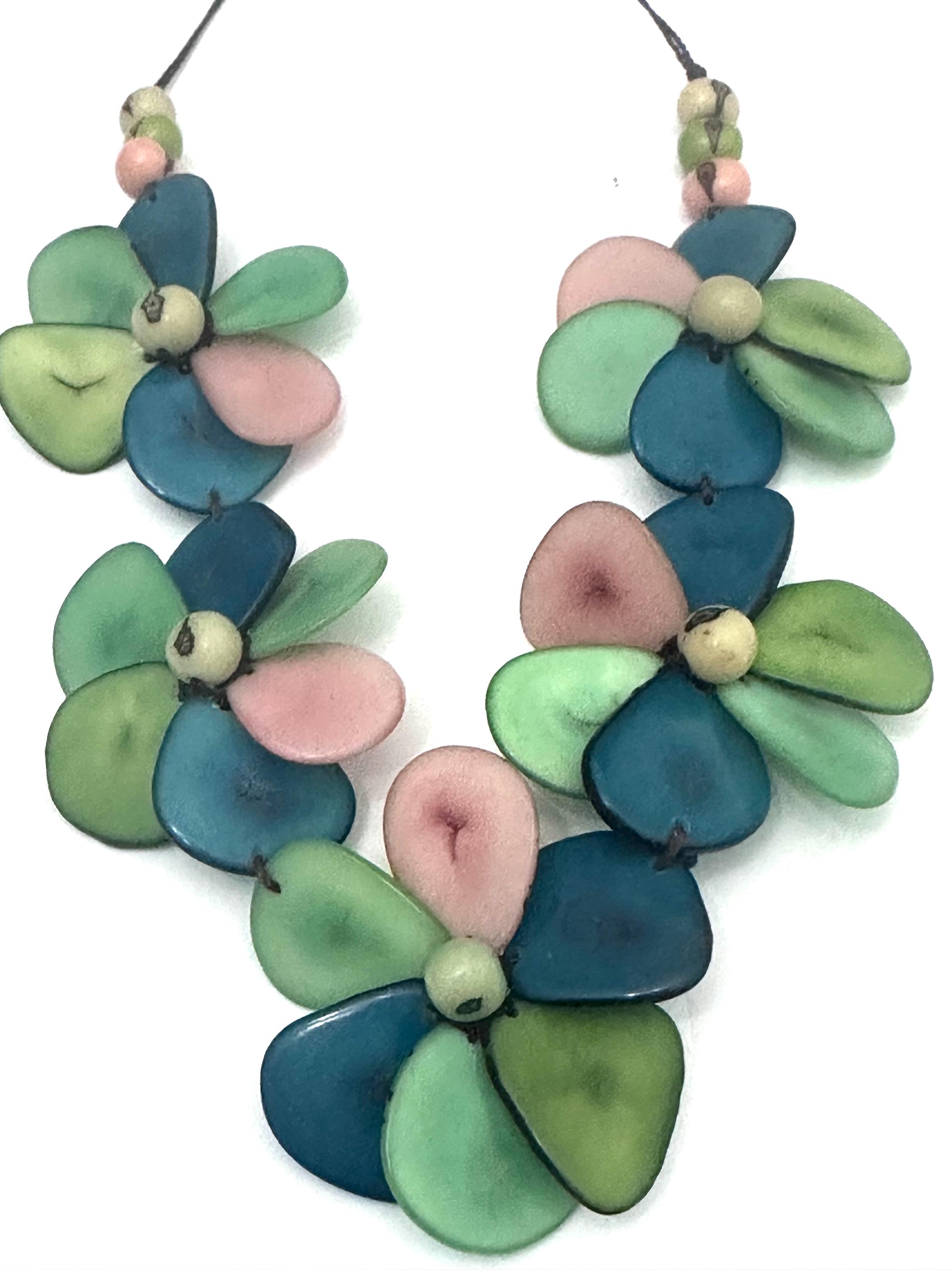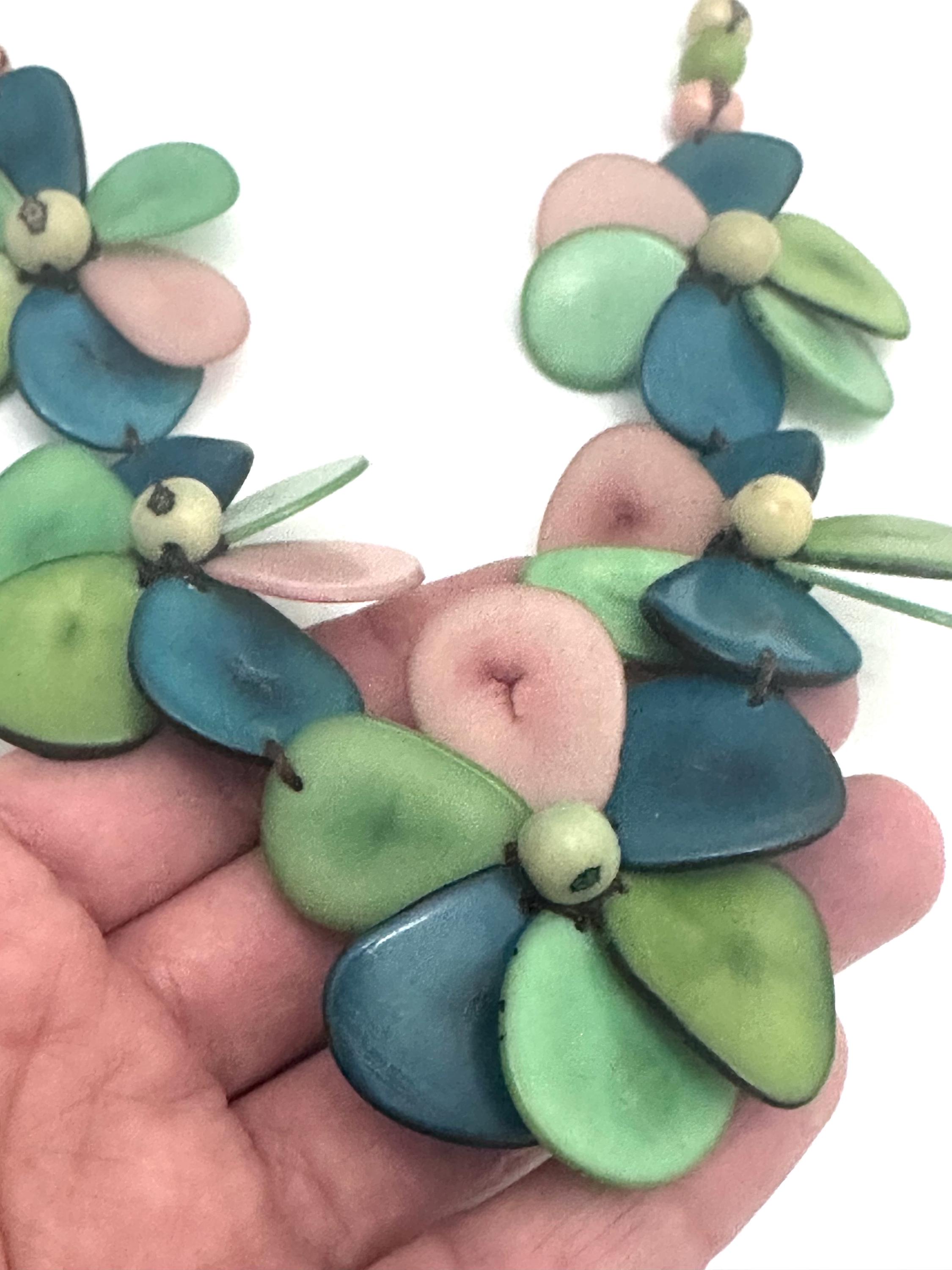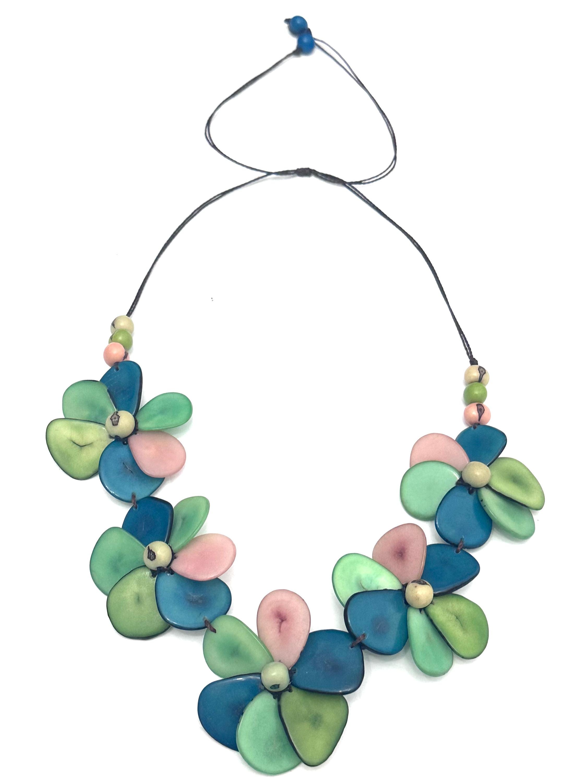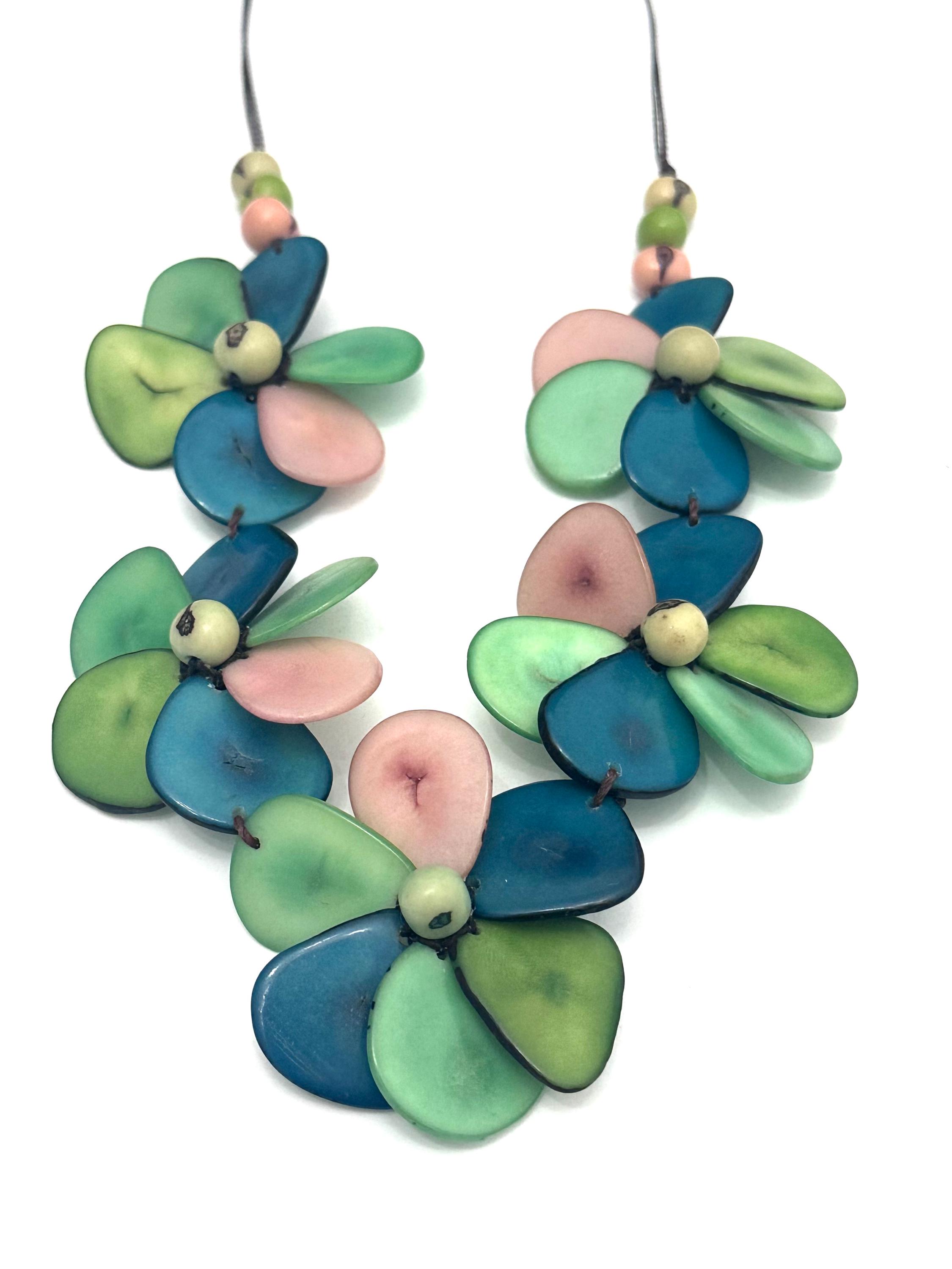 Statement Tagua Necklace, it features five beautiful flowers made with tagua slices petals on an adjustable string.