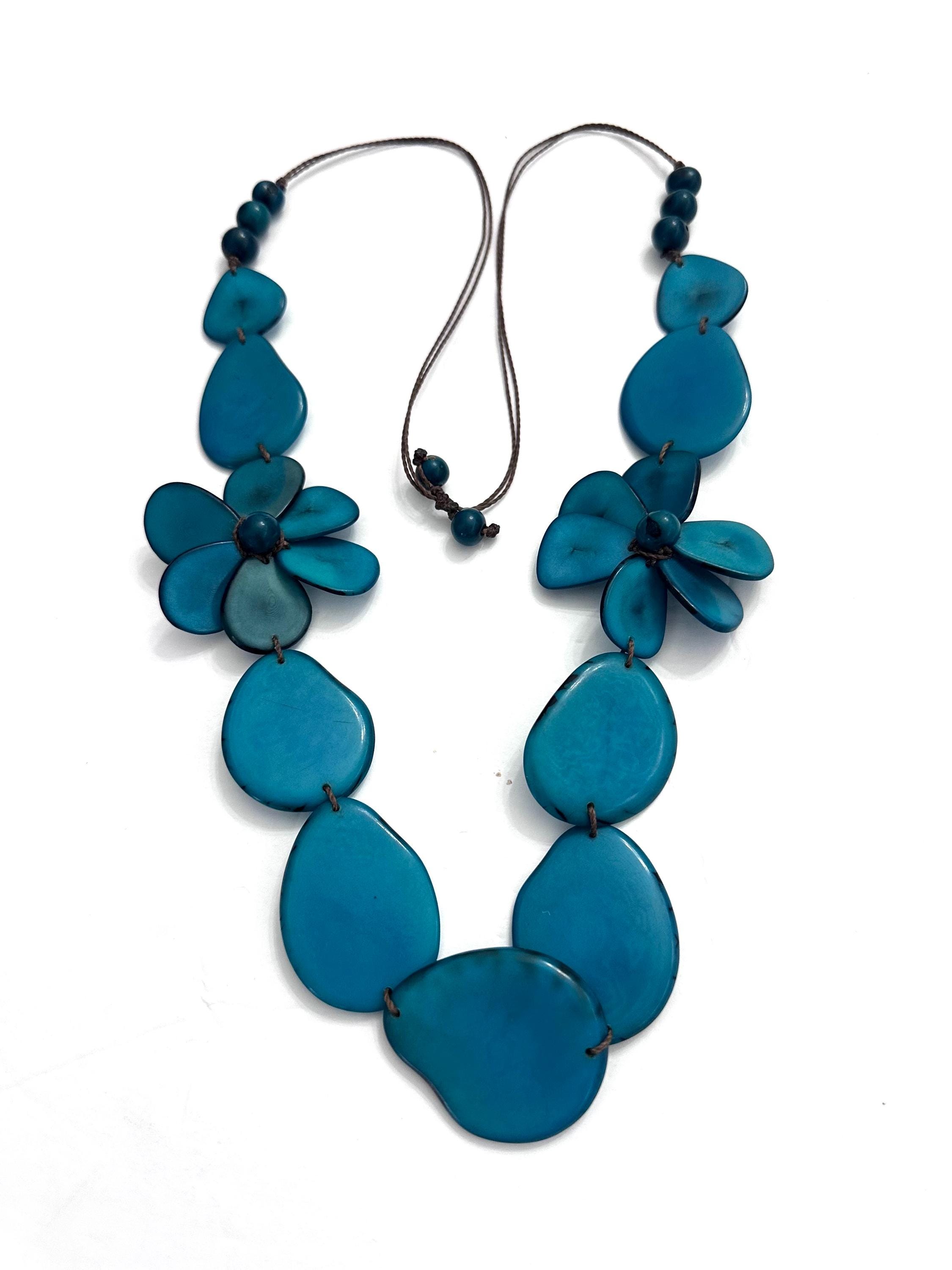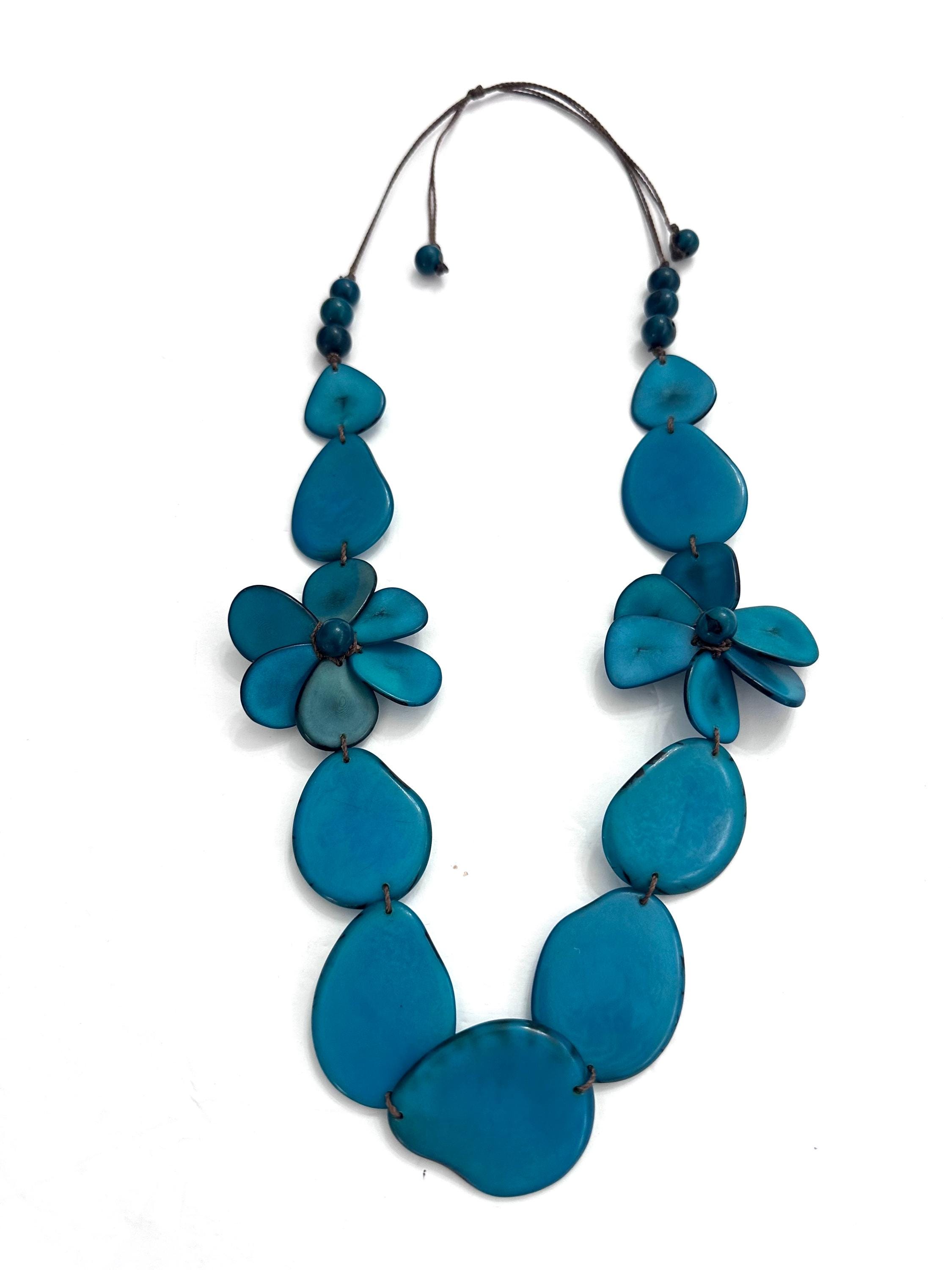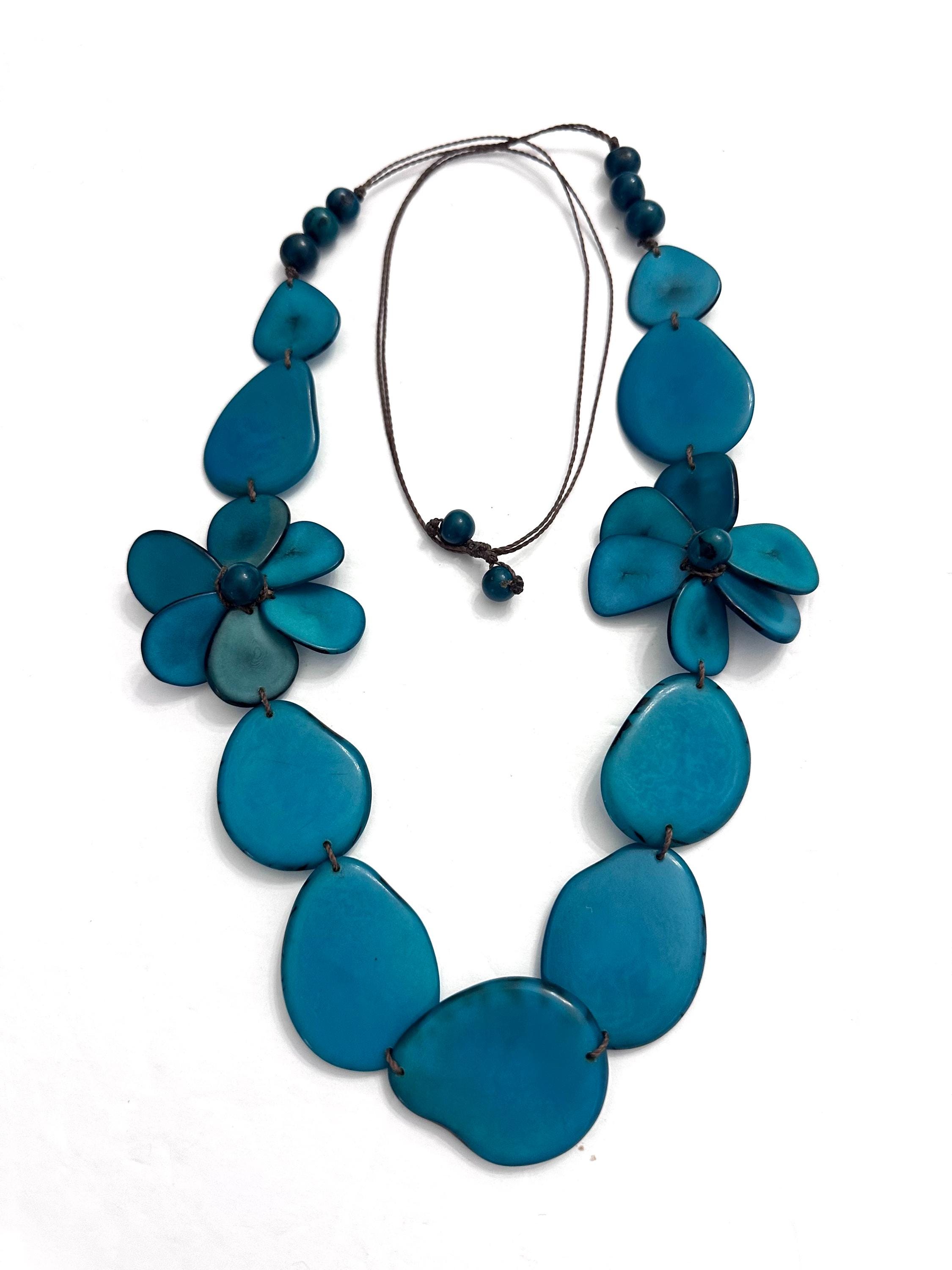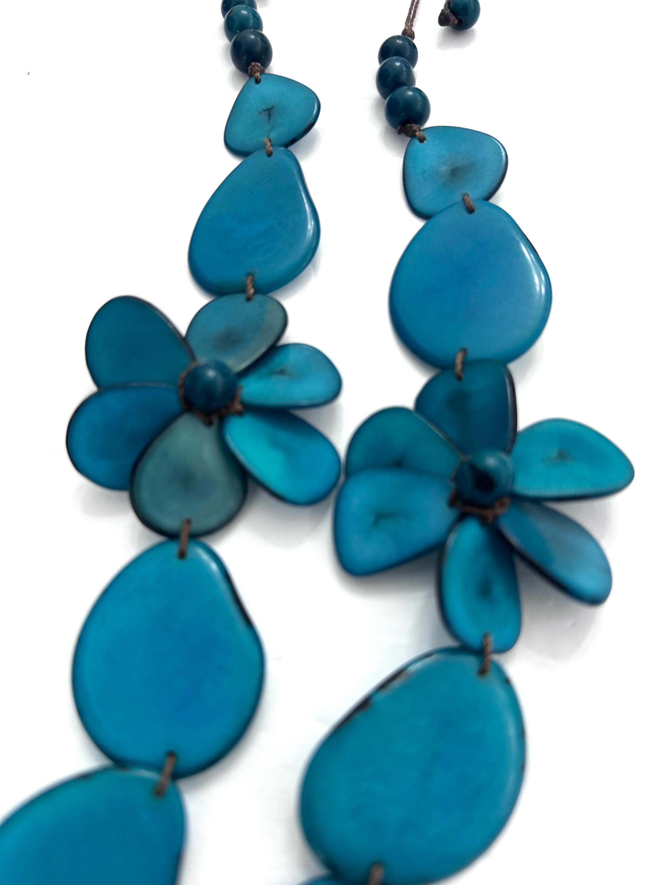 Statement Tagua Necklace, it features two beautiful flowers made with tagua slices petals on an adjustable string.