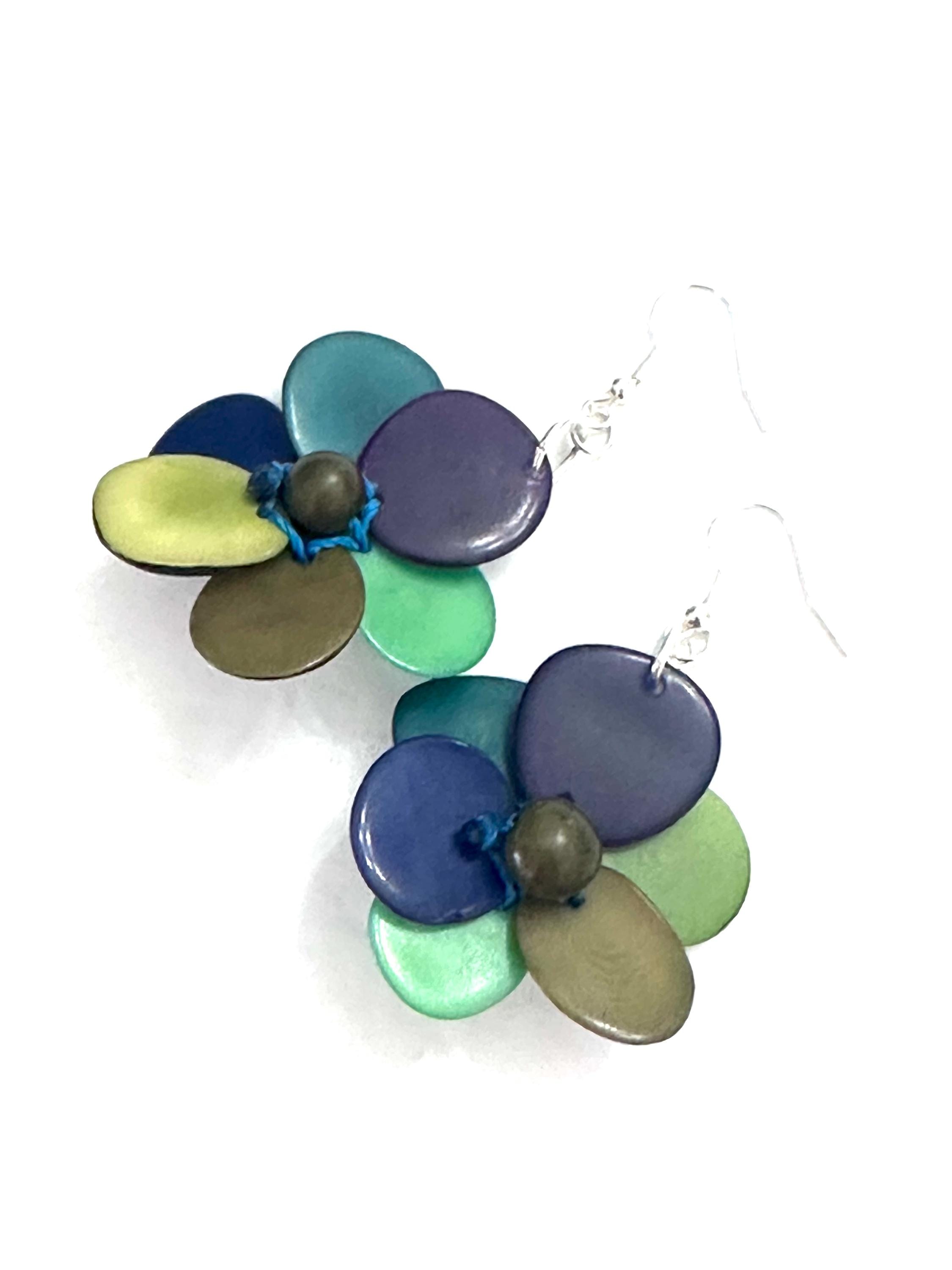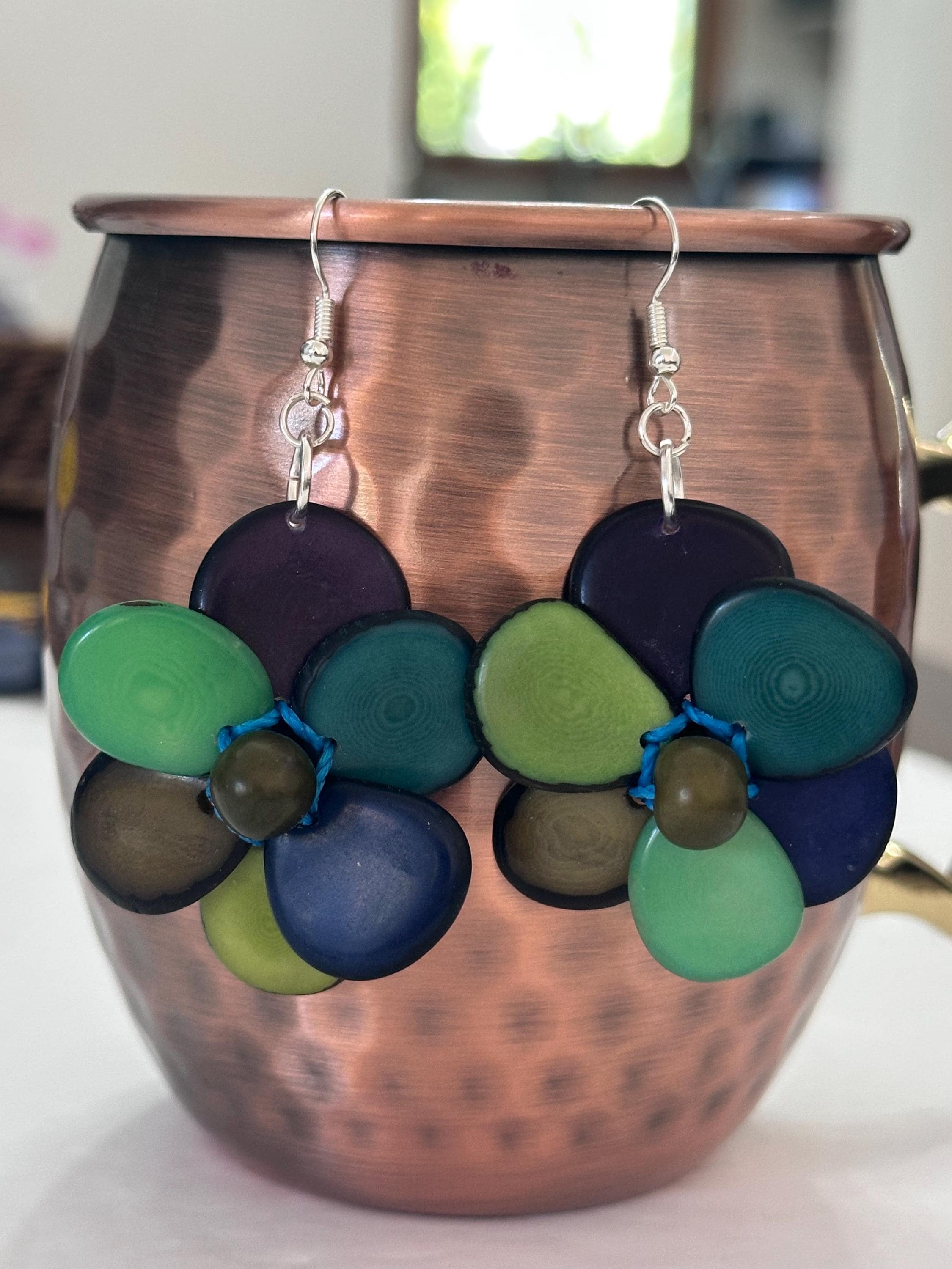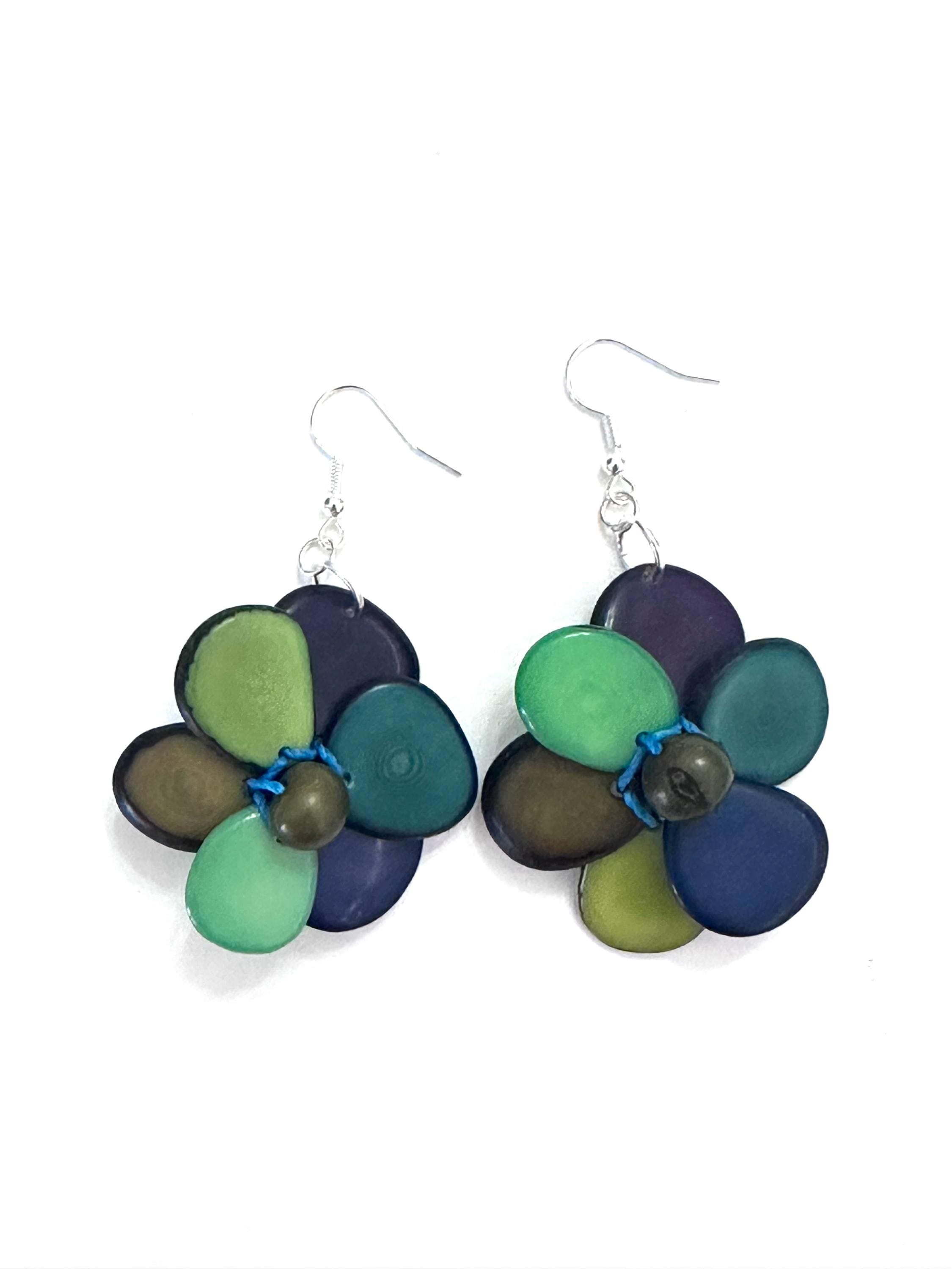 These unique and colorful dangle earrings are made from Tagua beads hang on silver toned ear wire.