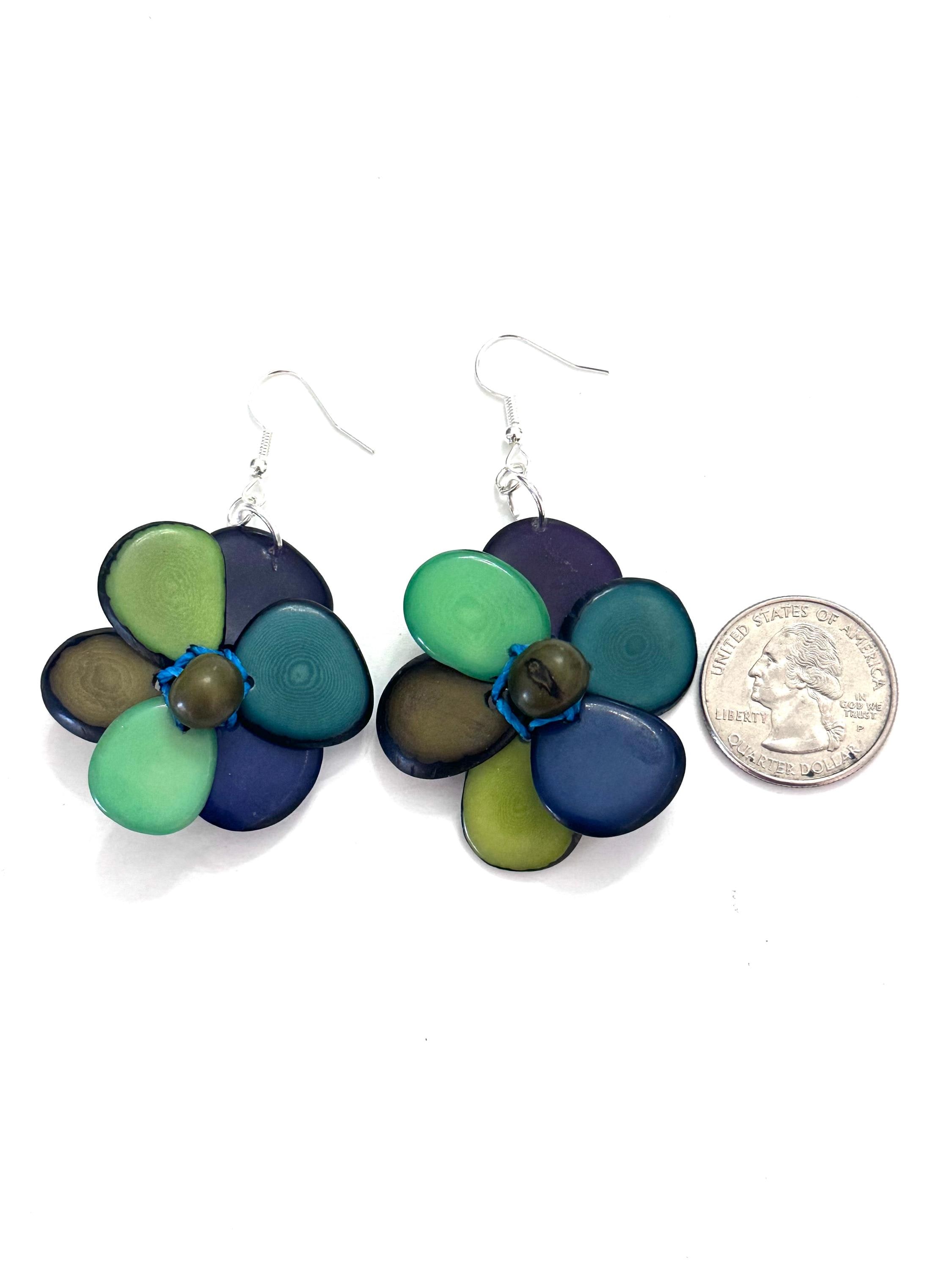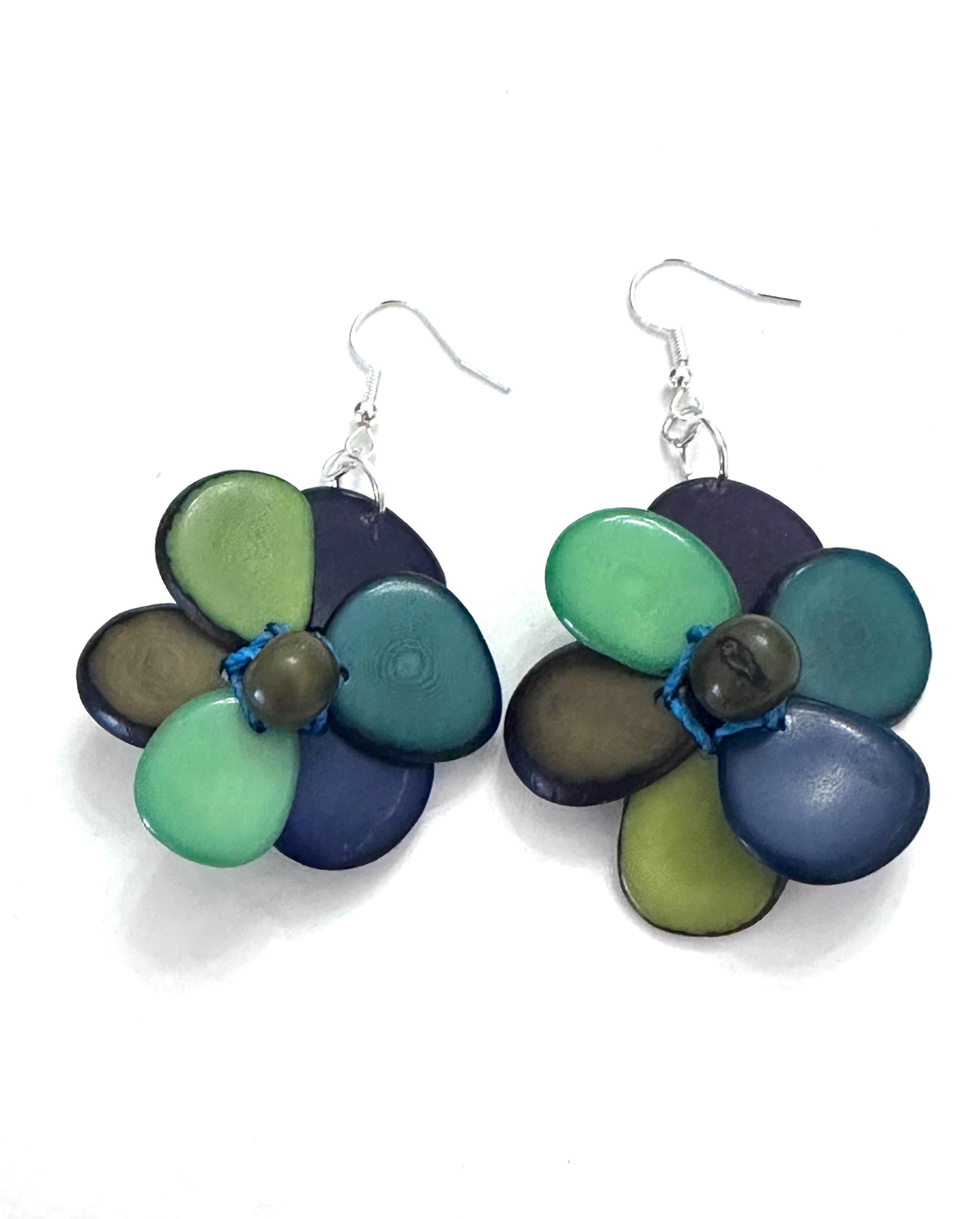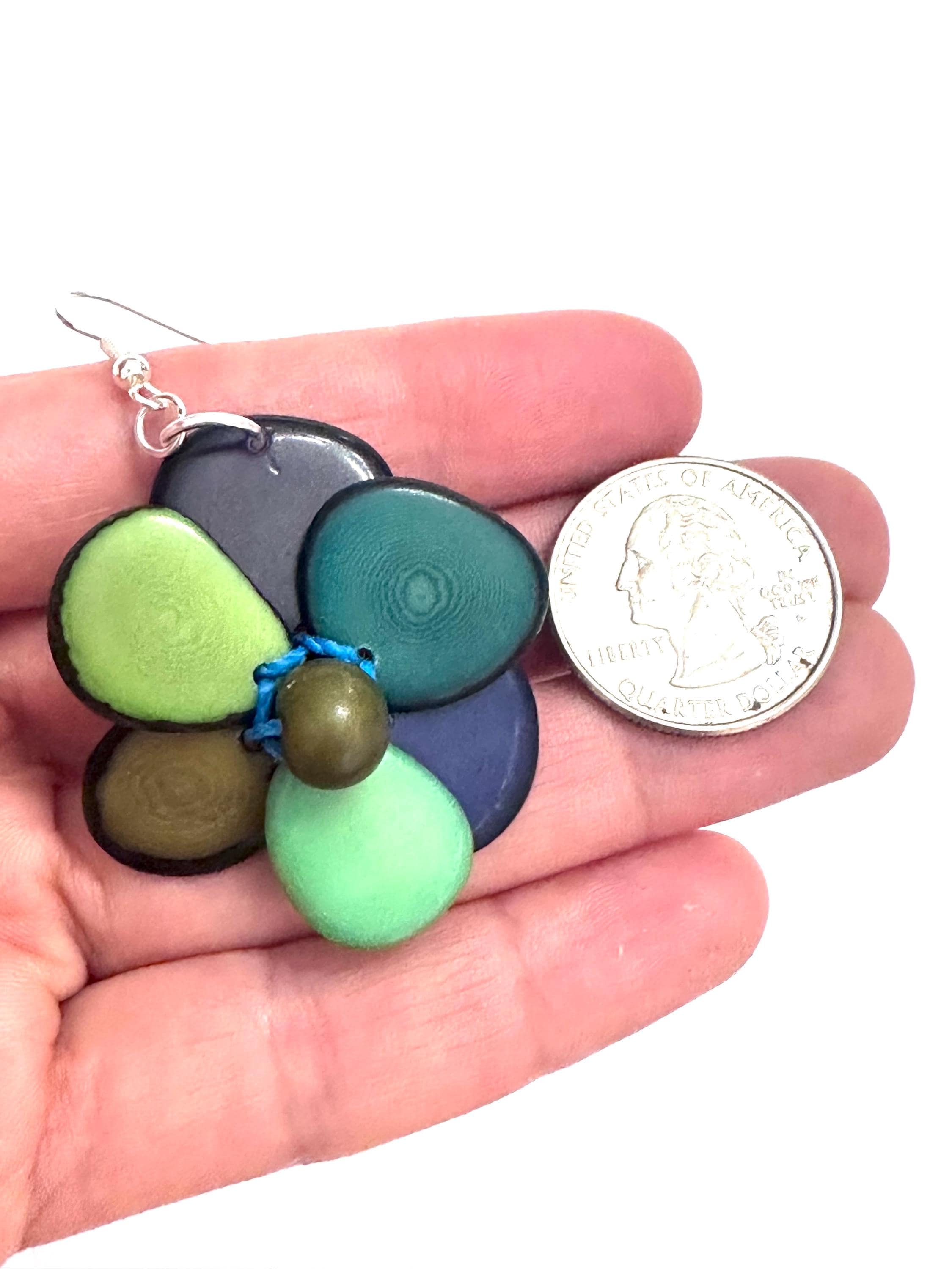 These unique and colorful dangle earrings are made from Tagua beads hang on silver toned ear wire.