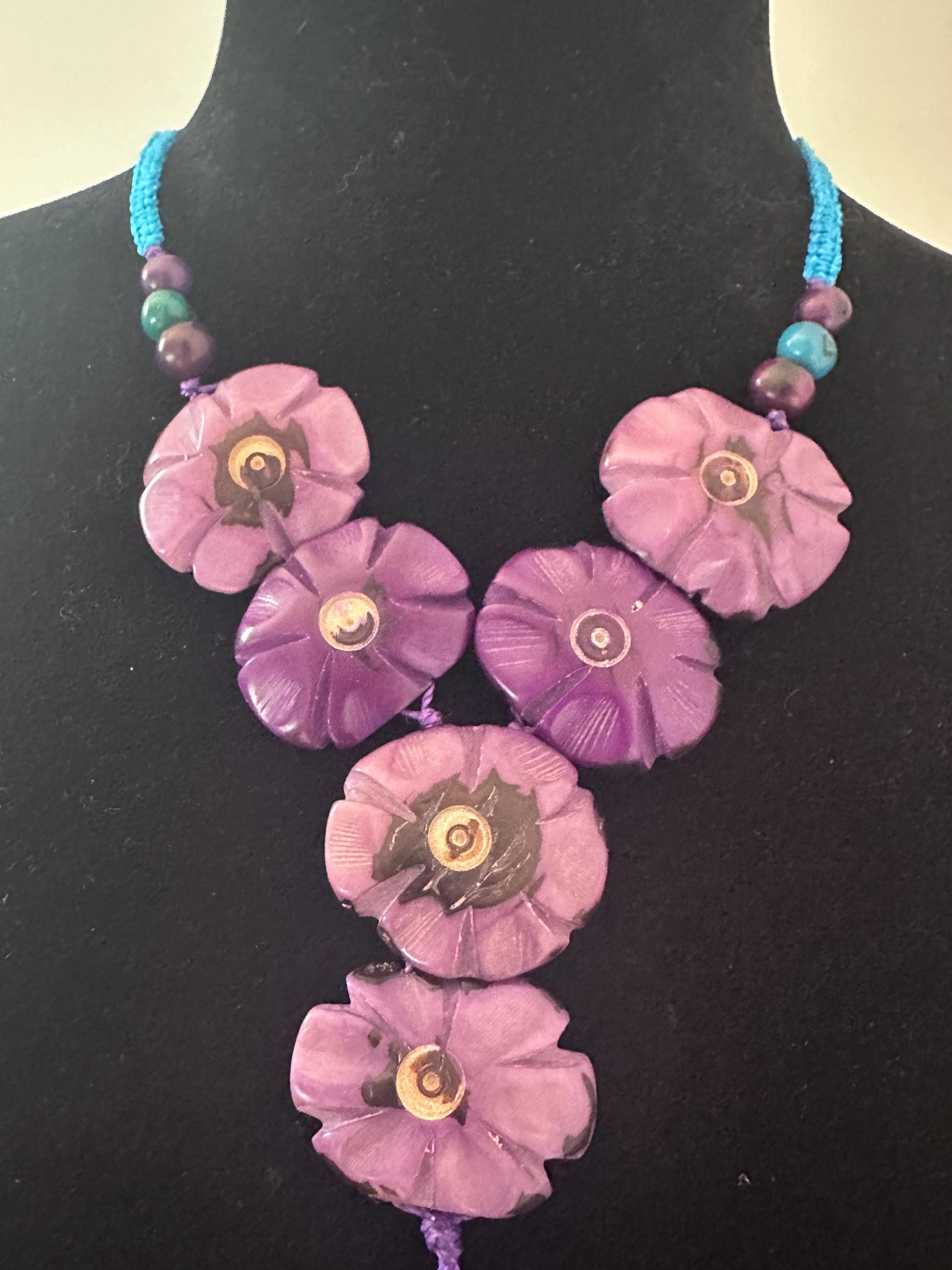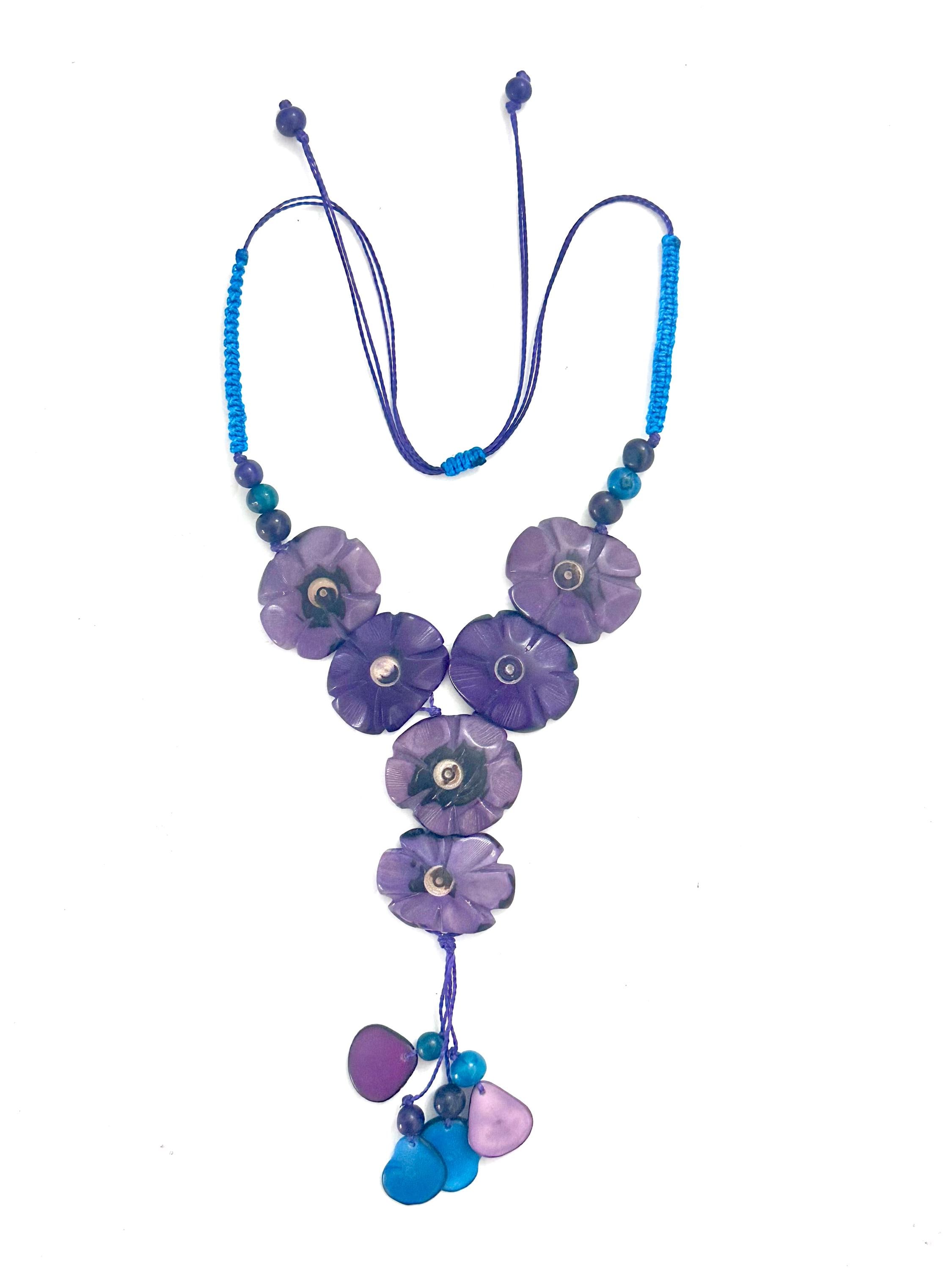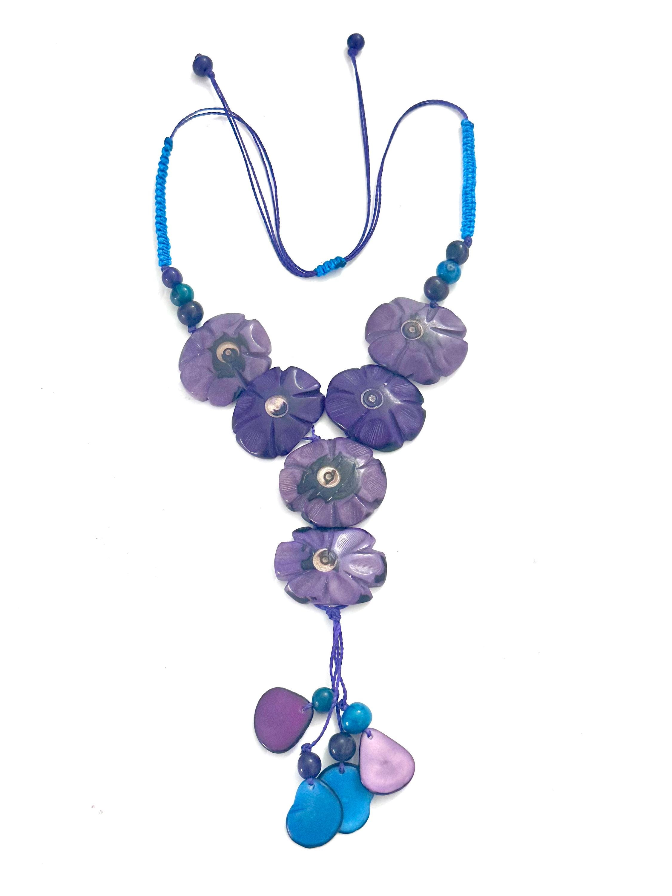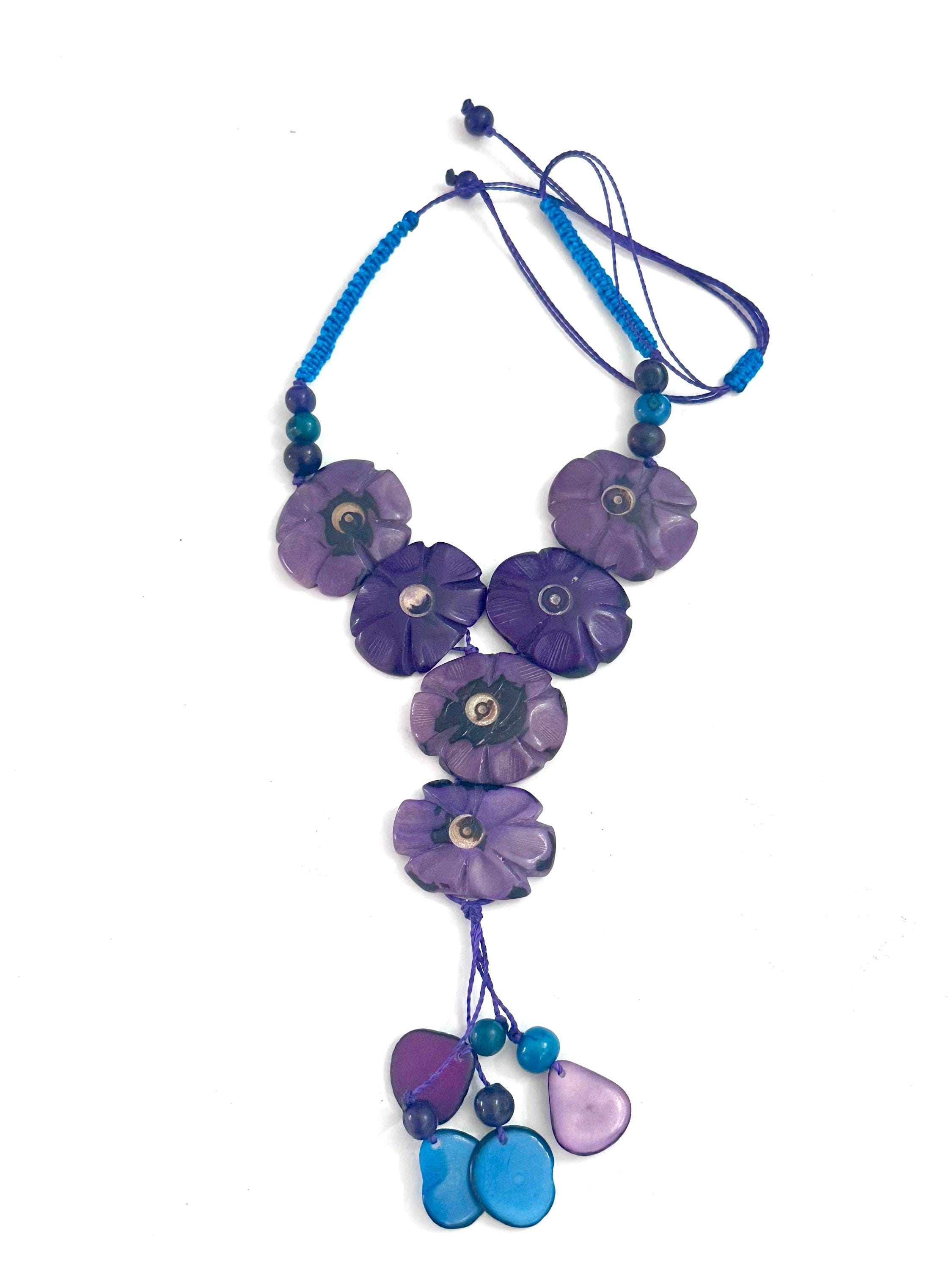 It features purple beautiful flowers made from tagua nut on an adjustable string.