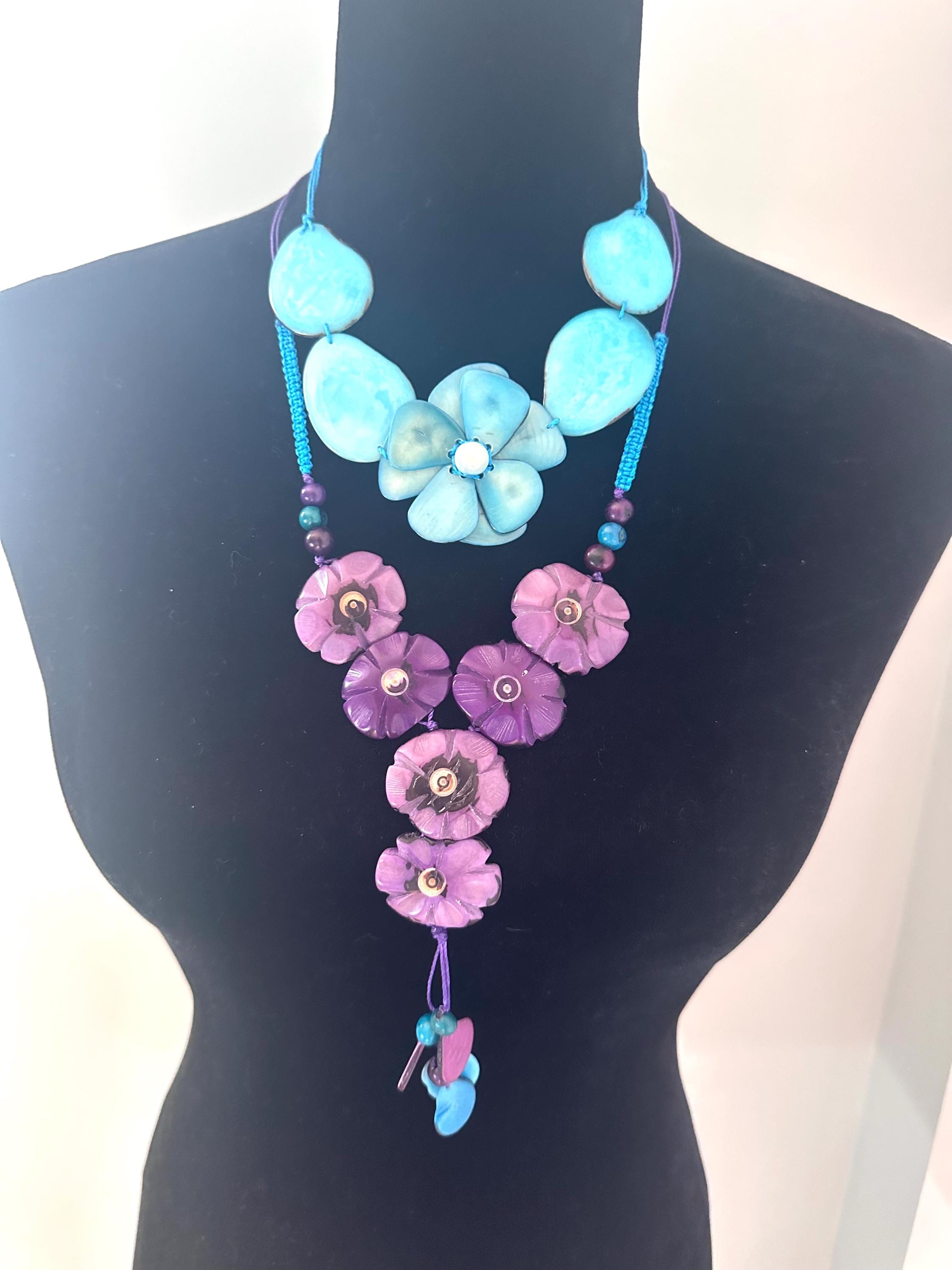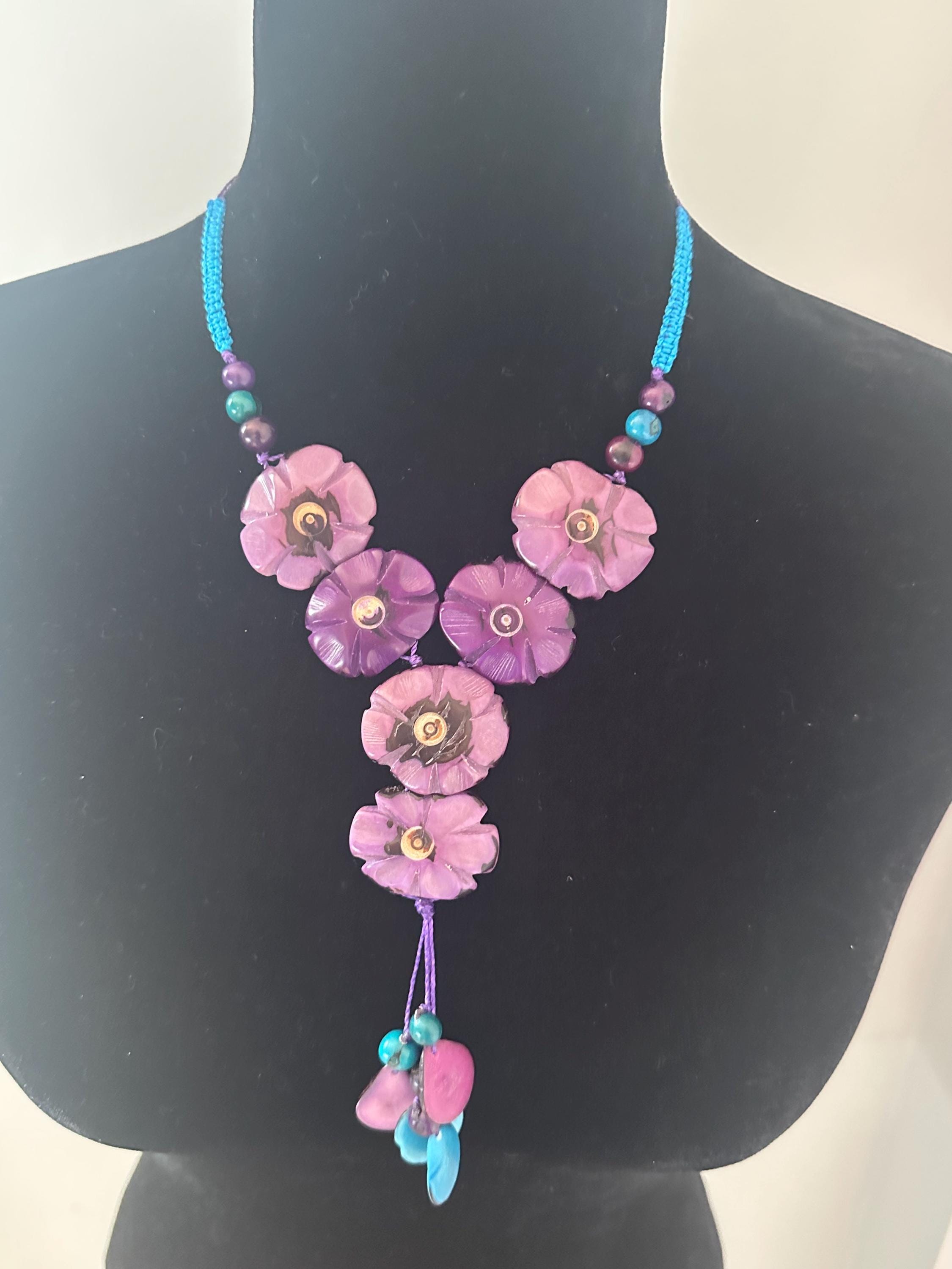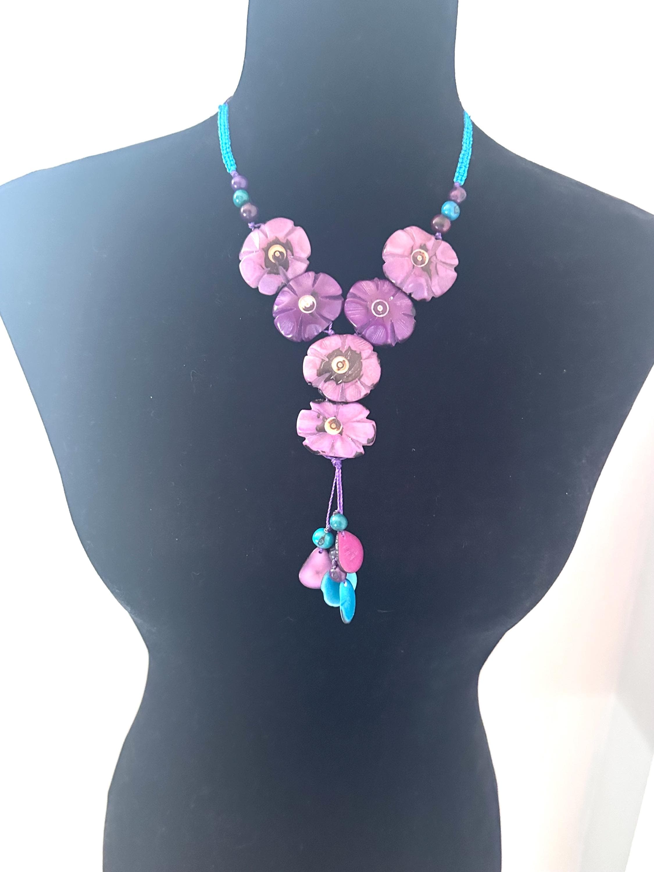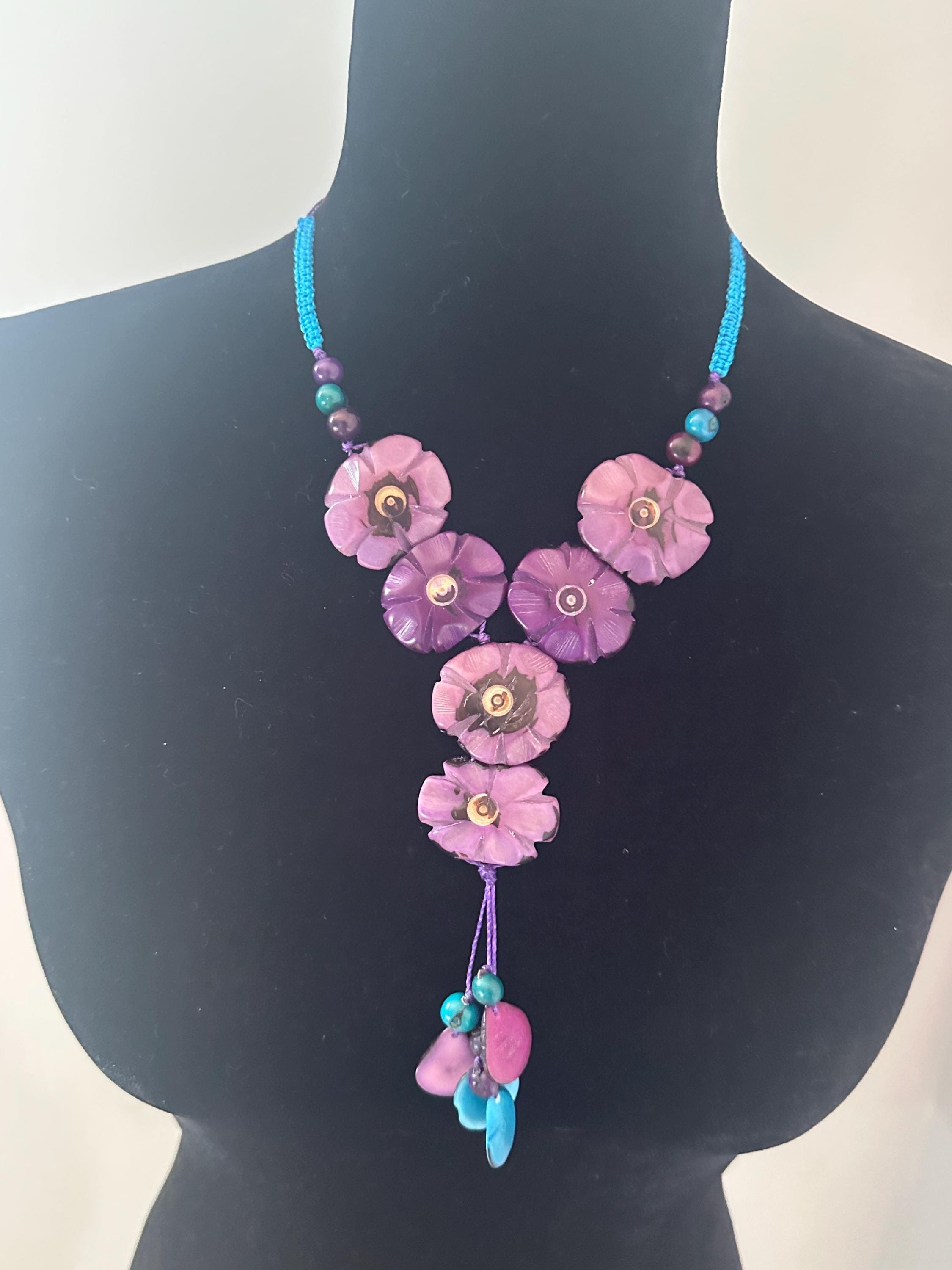 It features purple beautiful flowers made from tagua nut on an adjustable string.