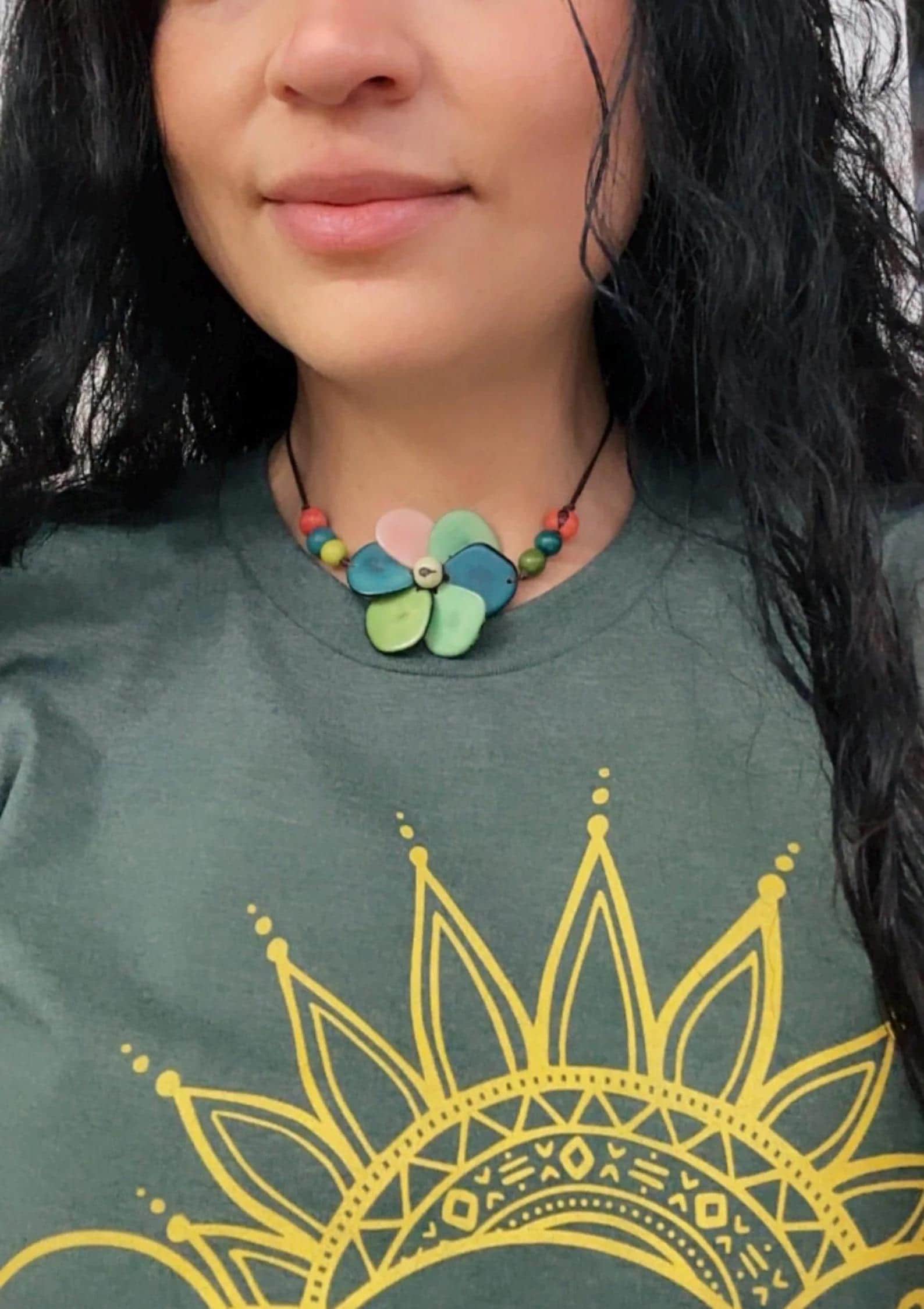 This is a unique necklace made with Tagua beads, açaí seeds, and waxed cord.