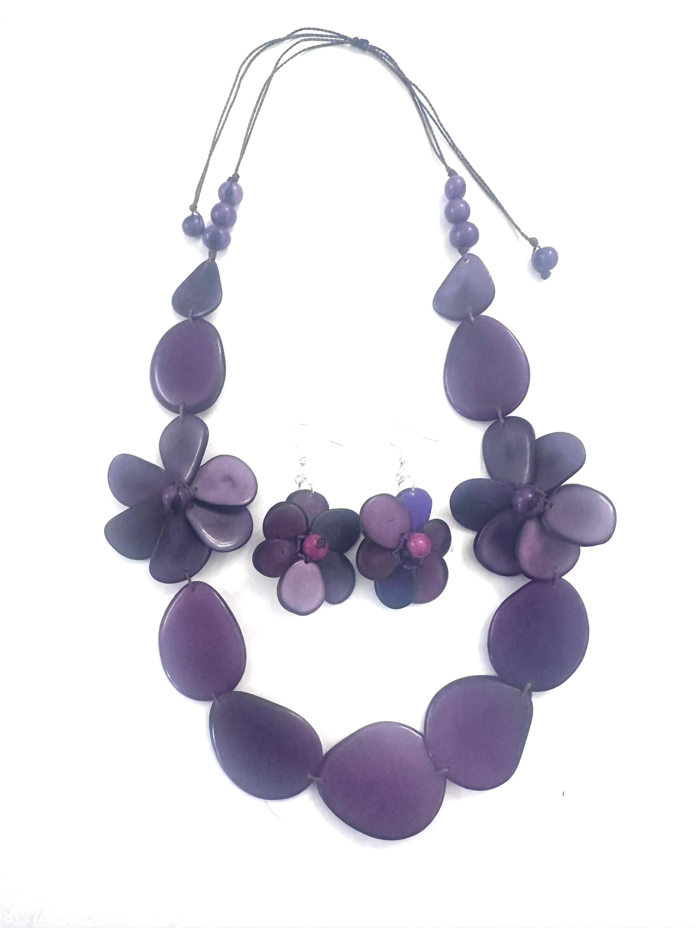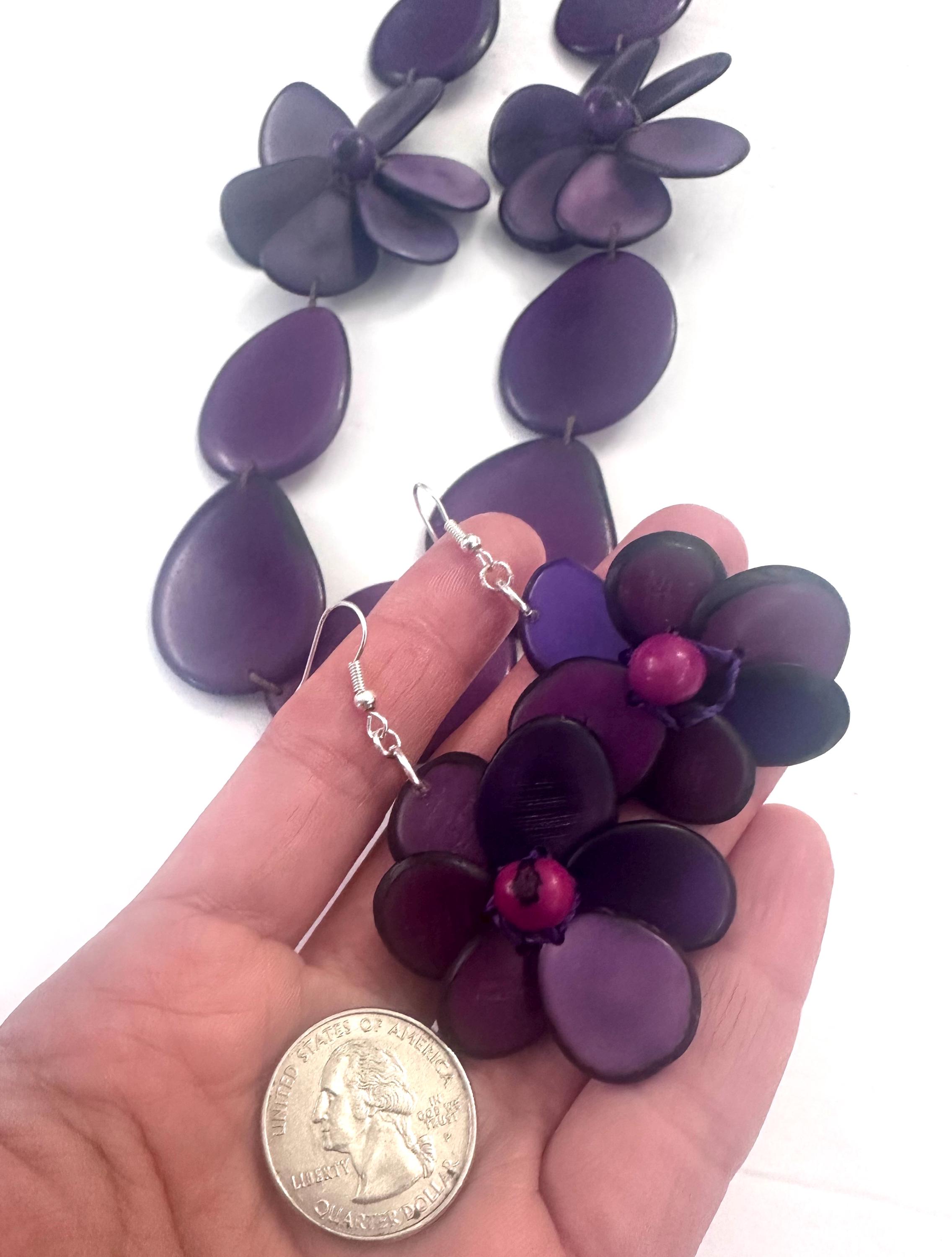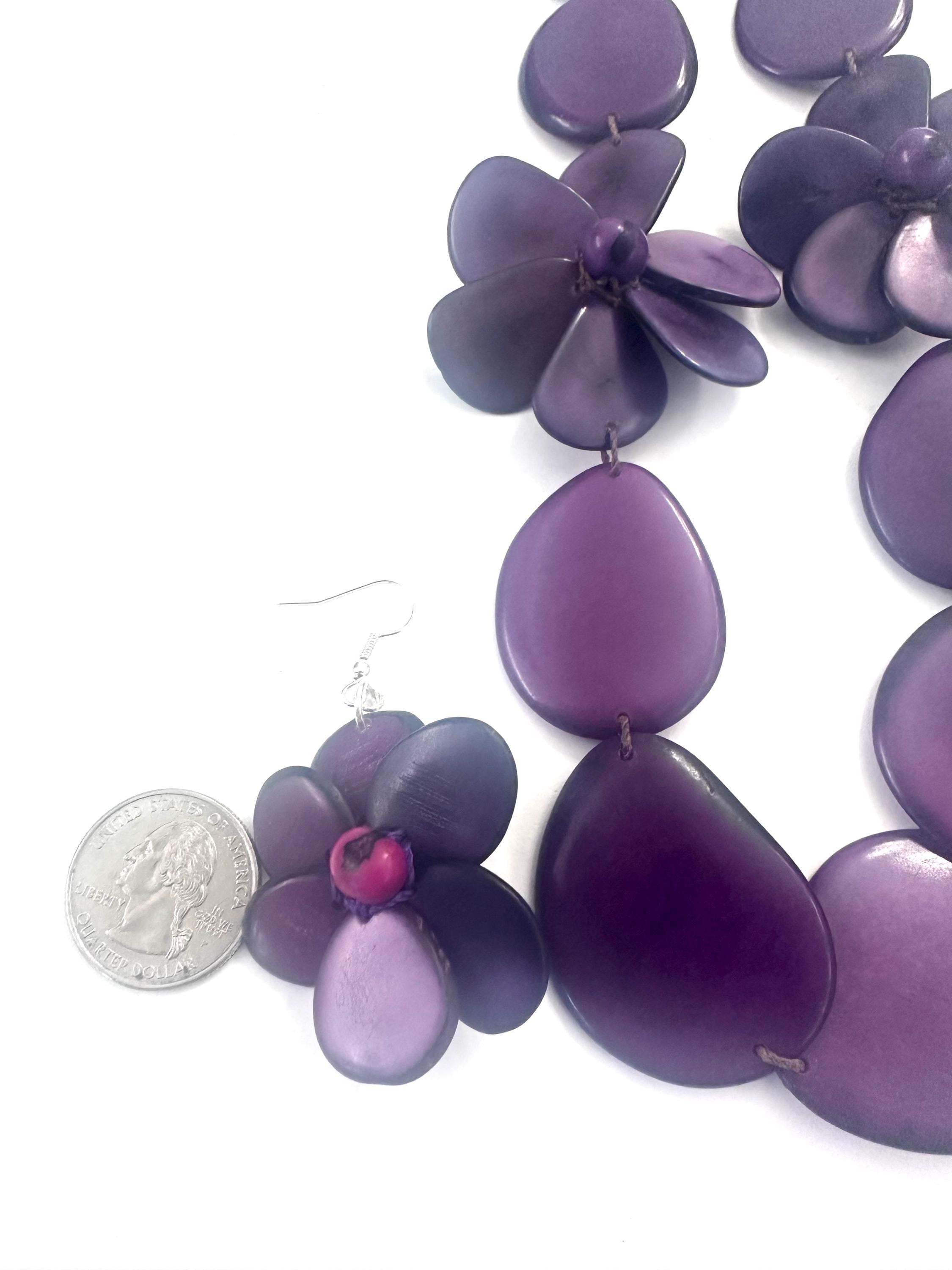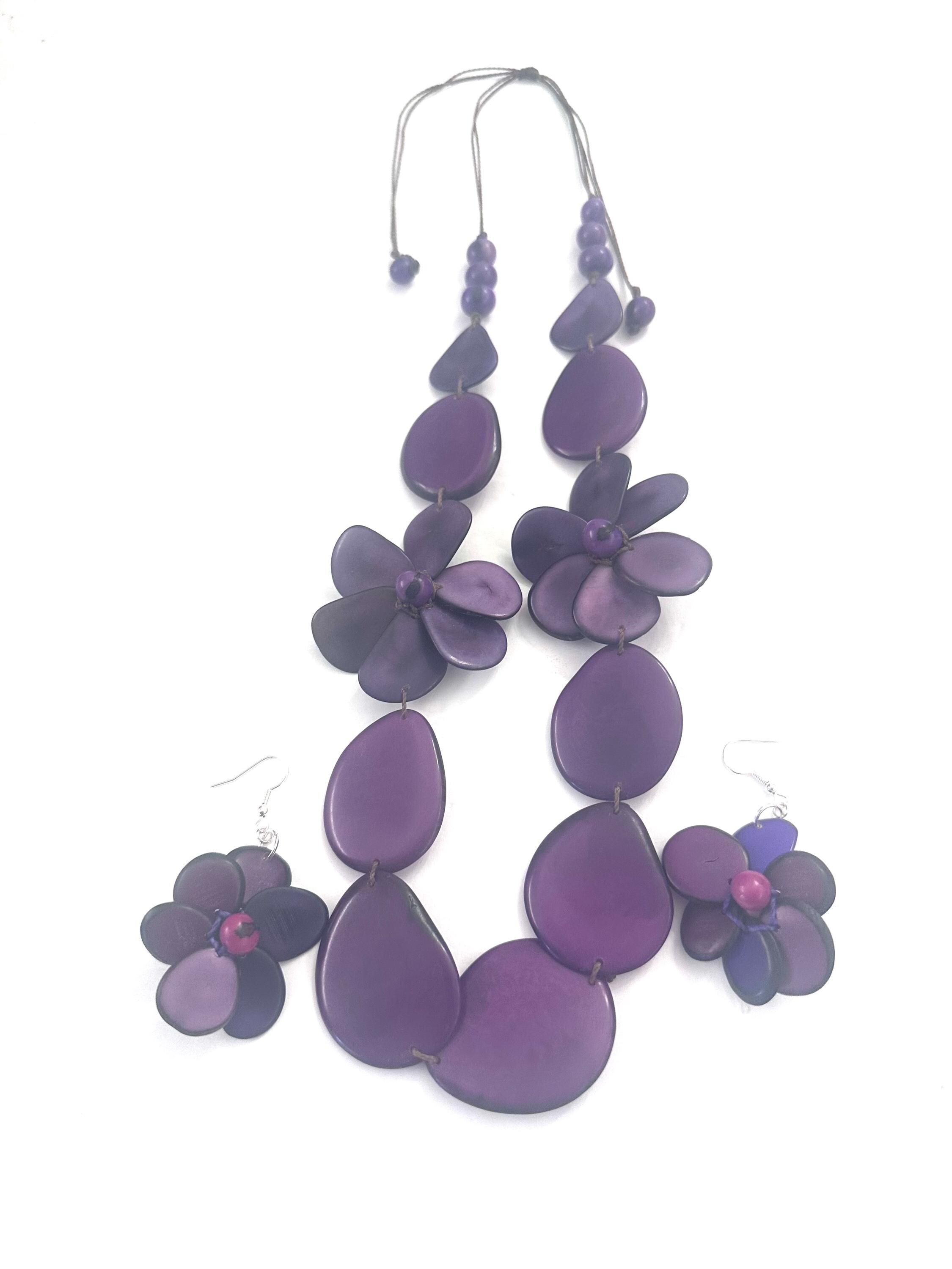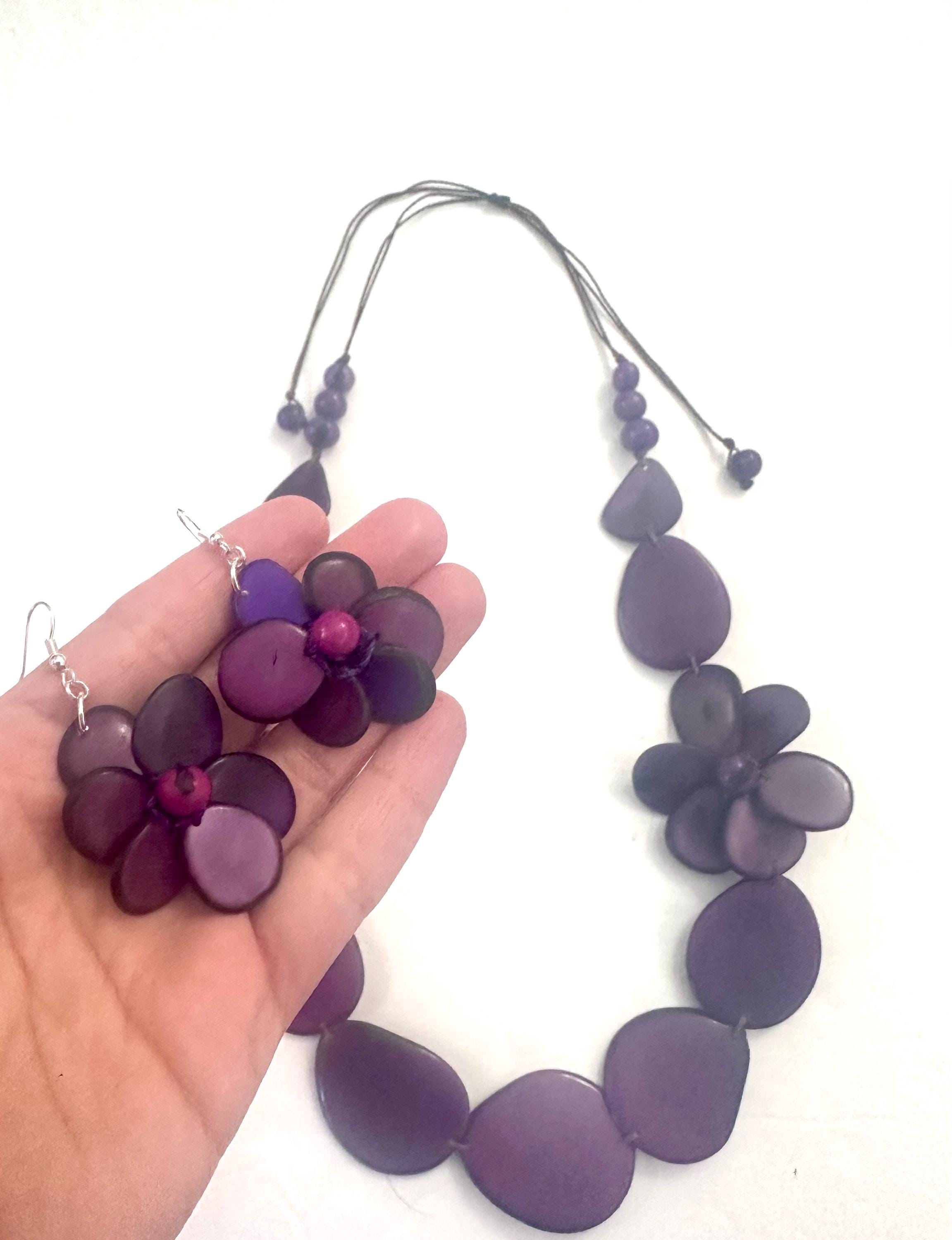 Statement Tagua Necklace and earrings set, it features beautiful flowers made with tagua slices petals on an adjustable string.