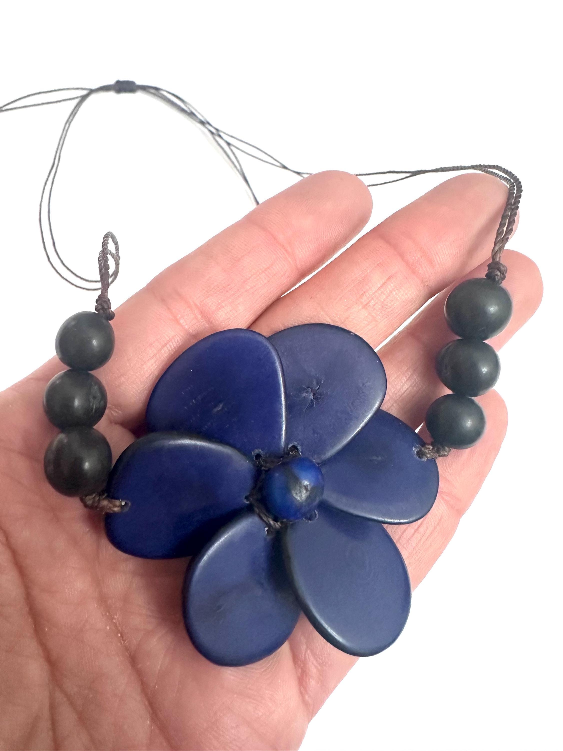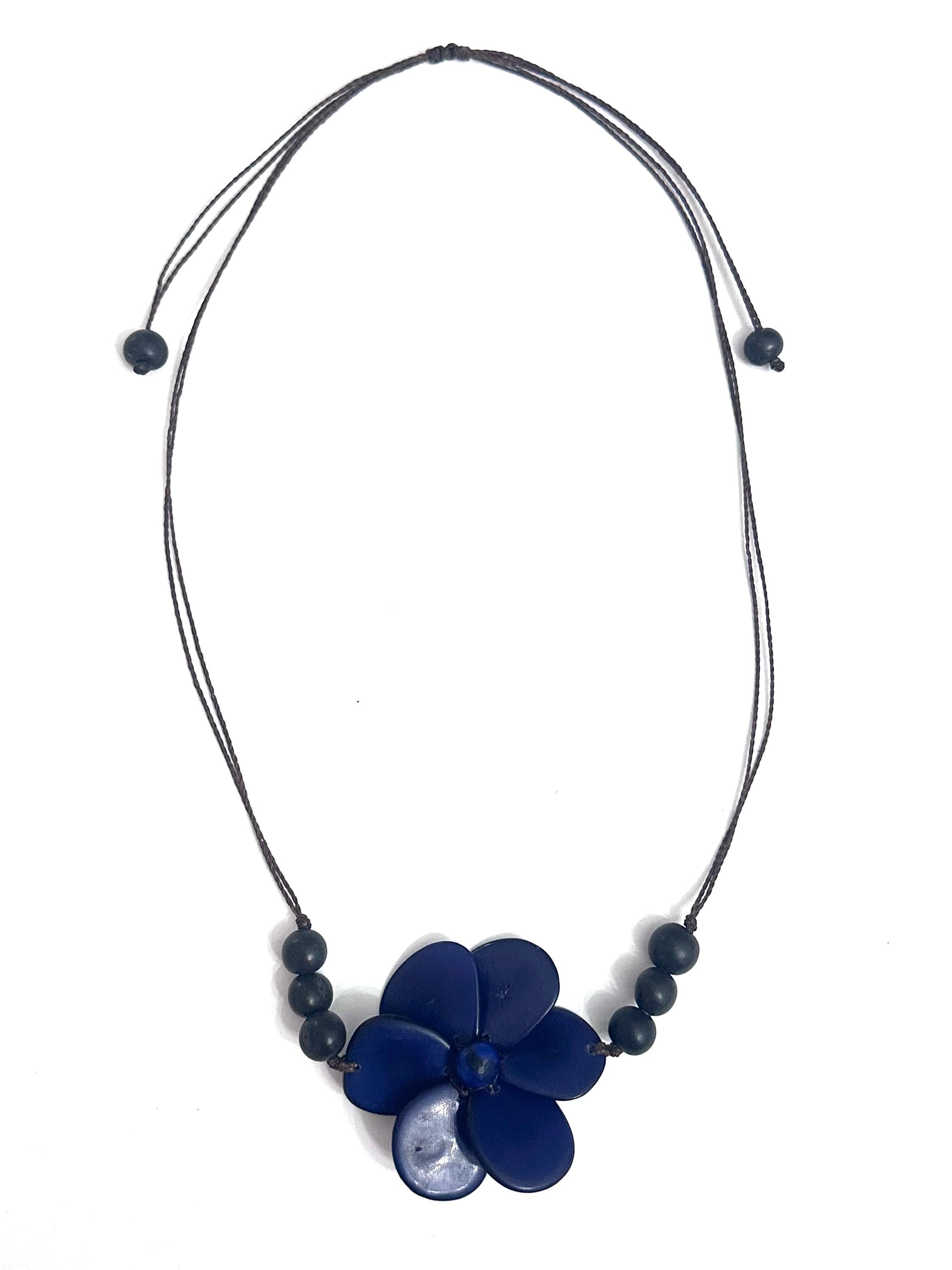Statement Tagua Necklace, it features a beautiful flower pendant made with tagua slices petals on an adjustable string.